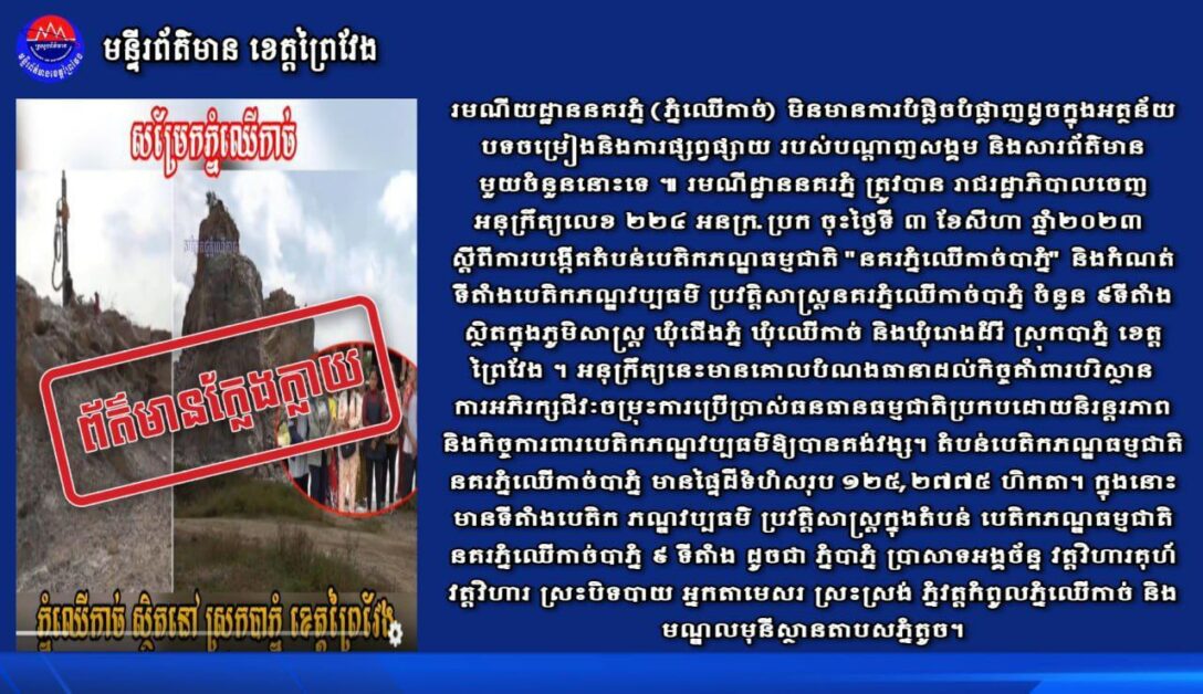 ការផ្សាយនៅលើបណ្ដាញសង្គម និងសារព័ត៌មានមួយចំនួនថាមានការបំផ្លិចបំផ្លាញនៅរមណីយដ្ឋាន“នគរភ្នំឈើកាច់” គឺជាព័ត៌មានមិនពិត