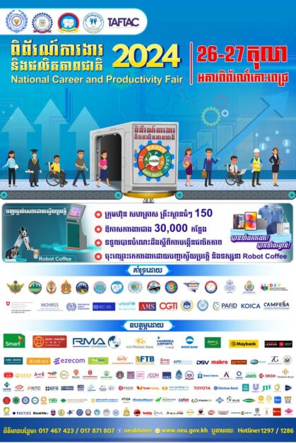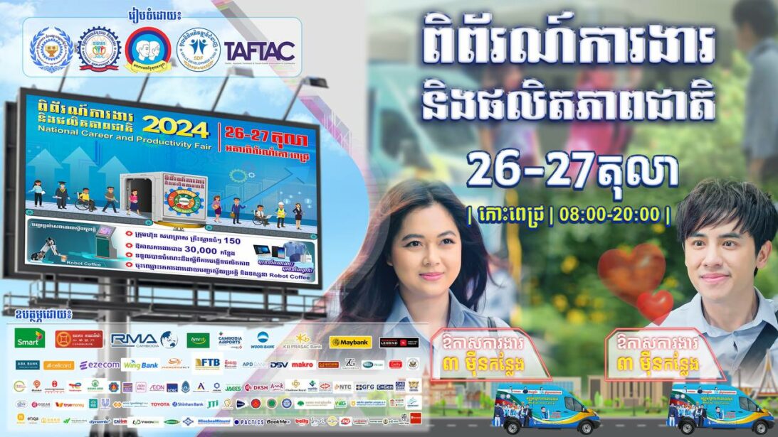 ទីភ្នាក់ងារជាតិមុខរបរ និងការងារ (NEA) នៃក្រសួងការងារ និងបណ្តុះបណ្តាលវិជ្ជាជីវៈ សហការជាមួយសហភាពសហព័ន្ធយុវជនកម្ពុជារាជធានីភ្នំពេញ, សមាគមវាយនភណ្ឌ សម្លៀកបំពាក់ ស្បែកជើង និងផលិតផលធ្វើដំណើរនៅកម្ពុជា, មូលនិធិអភិវឌ្ឍន៍ជំនាញ និងមានការគាំទ្រដោយអង្គការអន្តរជាតិខាងការងារ (ILO) រួមនិងដៃគូពាក់ព័ន្ធជាច្រើនទៀត នឹងរៀបចំ “ពិព័រណ៍ការងារ និងផលិតភាពជាតិឆ្នាំ២០២៤” នៅអាគារពាណិជ្ជកម្ម និងពិព័រណ៍កោះពេជ្រ រយៈពេល២ថ្ងៃជាប់គ្នា នៅថ្ងៃសៅរ៍-អាទិត្យ ទី២៦-២៧ ខែតុលា ឆ្នាំ២០២៤ ចាប់ពីម៉ោង ៨ព្រឹក ដល់ម៉ោង ៨យប់។ ពិព័រណ៍ការងារ និងផលិតភាពជាតិឆ្នាំ២០២៤នេះ នឹងមានការចូលរួមពីសំណាក់ក្រុមហ៊ុន សហគ្រាស ក្រសួង ស្ថាប័ន និងគ្រឹះស្ថានអប់រំបណ្តុះបណ្តាលចំនួនប្រមាណ ១៥០ ហើយមានស្តង់សរុបជាង ១៨០ ដែលនឹងដាក់តាំងបង្ហាញពីឱកាសការងារយ៉ាងច្រើនសម្បូរបែបជាង ៣ម៉ឺន កន្លែង ដោយក្រសួងរំពឹងថានឹងមានអ្នកចូលរួមប្រមាណជាង ៤ ម៉ឺននាក់។ លោក ហេង ថាវី ជំនួយការប្រធានគុណភាព និងសុវត្ថិភាព និងបរិស្ថាន នៃអាកាសយាន្តដ្ឋានកម្ពុជាលើកឡើងថា ក្រុមហ៊ុនបានត្រៀមរួចជាស្រេចដើម្បីចូលរួម នឹងនាំយកឱកាសការងារជាច្រើនកន្លែងដល់សិស្សនិស្សិត និងសាធារណៈជនដែលនឹងចូលរួមពិព័រណ៍រយៈពេល២ថ្ងៃខាងមុខនេះ។លោកបន្ថែមថាក្រុមហ៊ុនតែងតែចូលរួមក្នុងពិព័រណ៍ការងារ និងផលិតភាពជាតិនេះគឺដោយសារការចូលរួមពិព័រណ៍នេះ អាចឲ្យក្រុមហ៊ុនជ្រើសរើសបុគ្គលិកបានទាន់ពេលវេលា និងប្រកបដោយគុណភាព។ លោក ស៊ន ចាន់តូ ប្រធានផ្នែកគ្រប់គ្រងផ្នែកគុណវុឌ្ឍិតួនាទីការងារ និងជ្រើសរើសបុគ្គលិក នៃគ្រឹះស្ថានមីក្រូហិរញ្ញវត្ថុ អម្រឹត បានលើកឡើងថា នៅក្នុងព្រឹត្តិការណ៍ដ៏ធំ២ថ្ងៃខាងមុខនេះ អម្រឹត មានឱកាសការងាររាប់រយកន្លែងក្នុងមុខតំណែងផ្សេងៗគ្នាជាច្រើនសម្រាប់ផ្តល់ជូនដល់យុវជន សិស្ស/និស្សិតផងដែរ។ ដូច្នេះ យុវជន សិស្ស/និស្សិត សាធារណៈជនដែលមានបំណងចង់បានឱកាសការងារជាមួយនឹងអម្រឹត អាចយក CV មកចូលរួម នឹងសម្ភាសការងារជាមួយក្រុមការងារយើងនៅទីតាំងដោយផ្ទាល់បាន។គួរបញ្ជាក់ផងដែរថា ពិព័រណ៍ការងារ និងផលិតភាពជាតិ ឆ្នាំ២០២៤ ក៏នឹងត្រូវរៀបចំតាមប្រព័ន្ធអនឡាញផងដែរ ដែលអ្នកស្វែងរកការងារធ្វើនៅទូទាំងប្រទេស អាចដាក់ពាក្យស្វែងរកការងារធ្វើតាមប្រព័ន្ធអនឡាញបានតាមរយៈ គេហទំព័រពិព័រណ៌ការងារ http:/careerfair.nea.gov.kh/។