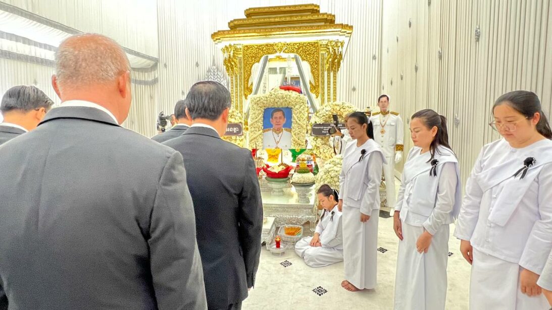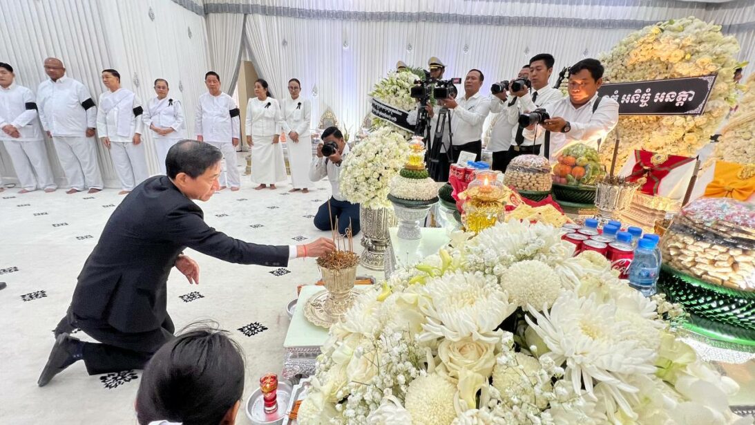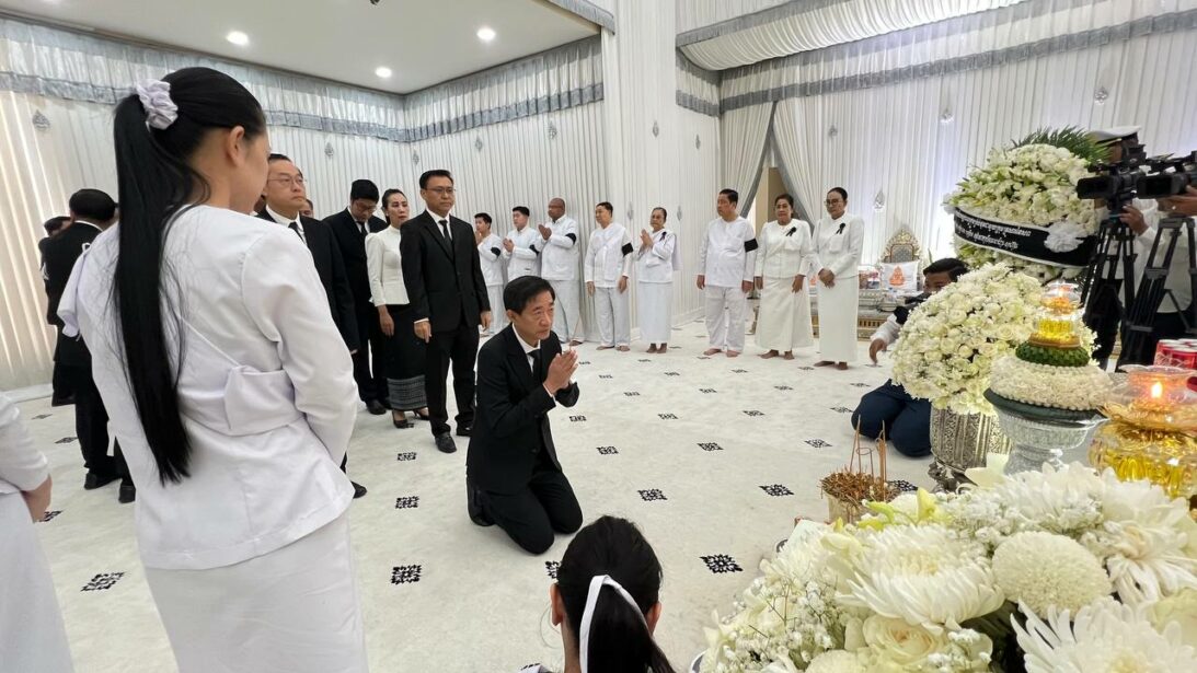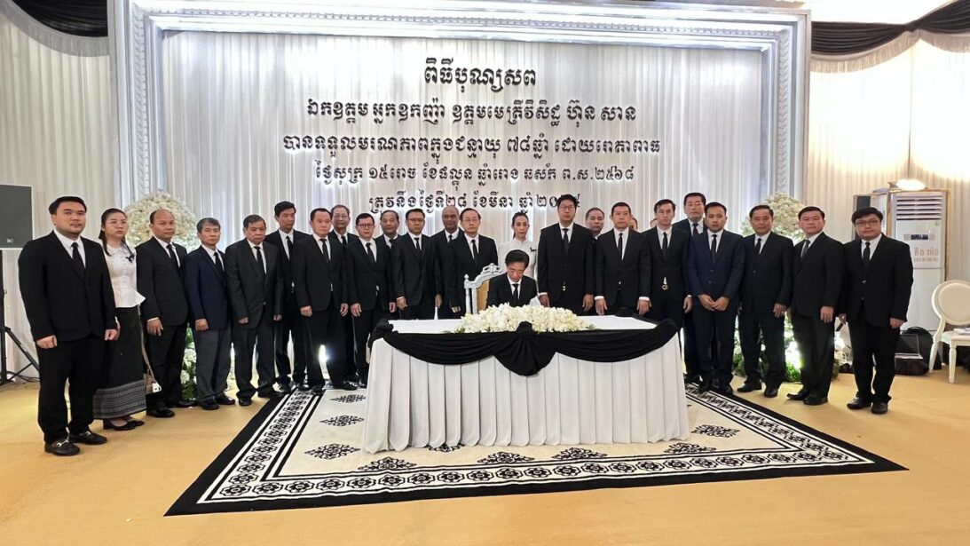 ក្នុងក្ដីសោកសង្រេងនេះ ឯកឧត្តមសាស្ត្រាចារ្យនាយក និងគណៈប្រតិភូ បានលំឱនកាយវាចាចិត្តគោរពវិញ្ញាណក្ខន្ធ និងបានបួងសួងដល់គុណបុណ្យព្រះរតនត្រ័យ គុណកែវទាំងបី វត្ថុស័ក្ដិសិទ្ធិទាំងឡាយក្នុងលោក សូមឱ្យវិញ្ញាណក្ខន្ធ ឯកឧត្តមអ្នកឧកញ៉ា ឧត្ដមមេត្រីវិសិដ្ឋ ហ៊ុន សាន បានទៅចាប់បដិសន្ធិ និងសោយសុខក្នុងសុគតិភពជានិច្ចនិរន្តរ៍កុំបីឃ្លៀងឃ្លាតឡើយ៕