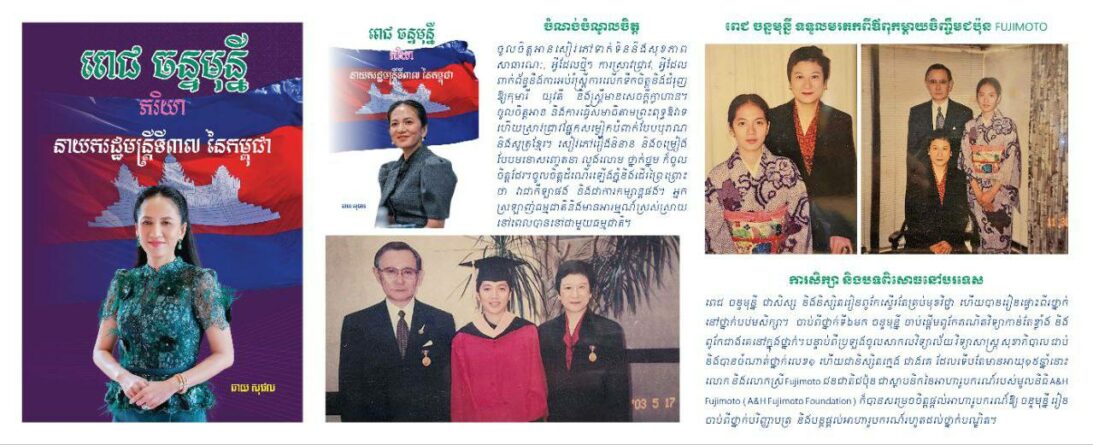 បើតាមការរៀបរាប់របស់អ្នកនិពន្ធ គឺលោកជំទាវបណ្ឌិត ពេជ ចន្ទមុន្នី ជាស្រ្តីទី១ដំបូងគេនៅកម្ពុជា ដែលបានបញ្ចប់ការសិក្សាថ្នាក់បណ្ឌិតនៅឯចក្រភពអង់គ្លេស និងមានជំនាញផ្នែកសុខភាពសាធារណៈ ហើយថា បើទោះបីជាប្រសូតនៅក្នុងត្រកូលបញ្ញវន្ត និងមានជីវភាពសមរម្យ ហើយក្រោយមក ក៏ក្លាយជាបញ្ញវន្តជាន់ខ្ពស់ មានឪពុកក្មេកជានាយករដ្ឋមន្រ្តី រហូតដល់ស្វាមីក្លាយជានាយរដ្ឋមន្រ្តីក៏ដោយ ក៏លោកជំទាវបណ្ឌិត នៅតែរក្សាបានចរិយាសម្បត្តិ សុភាព រាបសា រួសរាយ រាក់ទាក់ និងបន្តធ្វើការងារសង្គម និងមនុស្សធម៌ជាធម្មតា ដោយគ្មានការរើសអើង និងប្រកបដោយការទទួលខុសត្រូវ។