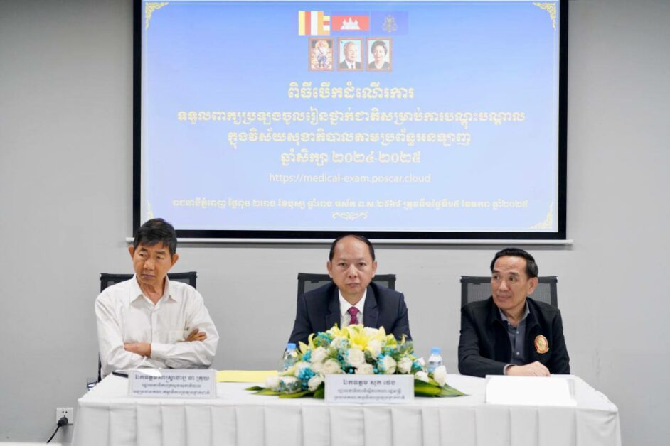 ឯកឧត្តម សុក ផេង រដ្ឋលេខាធិការ ទីស្តីការគណៈរដ្ឋមន្ត្រី និងជាប្រធានគណៈកម្មាធិការ ប្រឡងថ្នាក់ជាតិ សម្រាប់ការបណ្តុះបណ្តាល ក្នុងវិស័យសុខាភិបាល នាព្រឹកថ្ងៃទី១៥ ខែមករា ឆ្នាំ២០២៥ បានអញ្ជើញជាអធិបតី បើកដំណើរការទទួលពាក្យប្រឡងចូលរៀនថ្នាក់ជាតិ សម្រាប់ការបណ្តុះបណ្តាល ក្នុងវិស័យសុខាភិបាល តាមប្រព័ន្ធអនឡាញ ( (https://medical-exam.poscar.cloud/)https://medical-exam.poscar.cloud/) (https://medical-exam.poscar.cloud/) ។