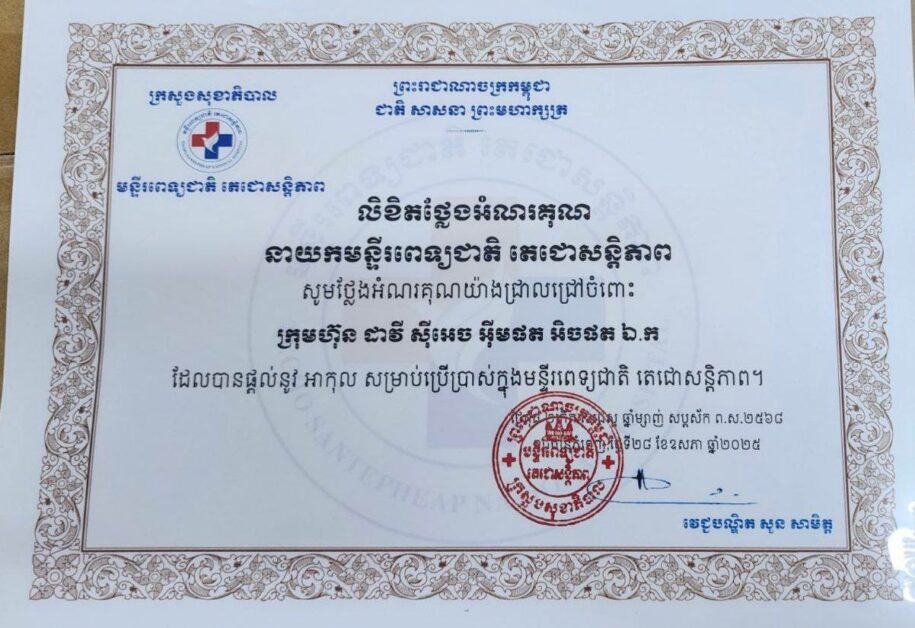 ដើម្បីចូលរួមចំណែកបន្តរទៅលើសុខភាពសាធារណៈជាមួយរាជរដ្ឋាភិបាលនិយាយជារួម និងនិយាយដោយឡែក តាមបណ្ដាក្រសួងស្ថាប័ណ្ណនានា និងតាមបណ្ដារមន្ទីពេទ្យនៅក្នុងព្រះរាជាណាចក្រកម្ពុជា នៅថ្ងៃទី២៨ខែឧសភា នេះសិប្បកម្ម ក្រុមហ៊ុន ដាវីស៊ីអេច បានបន្តផ្ដល់ជូននូវអាល់កុលទឹកជូនដល់មន្ទីពេទ្យជាតិ តេជោសន្តិភាព នូវអាល់កុលទឹកចំនួន៥០កាន សើ្មរនិង ១៥០០លីត្រ ដើម្បីយកទៅប្រើប្រាស់ និងរួមចំណែកការពារអនាម័យសុខភាពដល់មន្រ្តី បុគ្គលិក និងបងប្អូនប្រជាពលរដ្ឋ ដែលមកទទួលសេវាសាធារណៈ។គួរំលឹកថា: កត្តាសុខភាពត្រូវបានប្រមុខរាជរដ្ឋាភិបាលចាត់ទុកជាកត្តាអាទិភាពគន្លឹះ ក្រោមការដឹកនាំដោយសម្ដេចតេជោហ៊ុនសែន អតីតនាយករដ្ឋមន្រ្តី និងជាប្រធានក្រុមឧត្តមប្រឹក្សាផ្ទាល់ព្រះមហាក្សត្រ និងជាប្រធានព្រឹទ្ធសភា នាពេលបច្ចុប្បន្ន និងក្រោមការដឹកនាំបន្ត ដោយសម្ដេចមហាបវរធិបតី ហ៊ុន ម៉ាណែត នាយករដ្ឋមន្រ្តីនៃកម្ពុជា បានយកចិត្តទុកដាក់ទៅលើសុខភាពសារធារណៈ ជូនបងប្អូនប្រជាពលរដ្ឋ ដើម្បីការកាត់បន្ថយភាពក្រីក្រ និងការអភិវឌ្ឍន៍ សង្គម-សេដ្ឋកិច្ចកម្ពុជាផងដែរ។