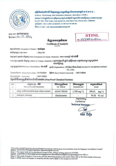សូមបញ្ជាក់ថា សិប្បកម្ម ដាវី ស៊ីអេច ដែលមានទីតាំនៅភូមិក្ដីតាកុយ សង្កាត់វាលស្បូវ ខណ្ឌច្បាអំពៅ រាជធានីភ្នំពេញបានផលិតផលកែច្នៃឡើងវិញពីសម្ភារៈដែលត្រូវបានបោះចោលចេញពីកាកសំណល់ស្រាបៀ ត្រូវបានផលិតជាអាល់កុលទឹក ដែលបានឆ្លងកាត់នូវមន្ទីពិសោធជាតិ ក្នុងការប្រើប្រាស់សម្រាប់ជួយដល់វិស័យសុខាភិបាល ជាពិសេសតាមបណ្ដាមន្ទីពេទ្យ ក៏ដូចជាជីវភាពរស់នៅប្រចាំថ្ងៃរបស់ប្រជាពលរដ្ឋក្នុងសង្គមកម្ពុជា ដែលកែច្នៃដោយសិប្បកម្ម ក្រុមហ៊ុន ដាវី ស៊ីអេច ដែលជាក្រុមហ៊ុនស្នាដៃកូនខ្មែរដំបូងនៅកម្ពុជាដែលមានការទទួលស្គាល់ និងឯកភាពគាំទ្រដោយក្រសួងបរិស្ថាន និងការចុះបញ្ជីម៉ាកពីក្រសួង ពាណិជ្ជកម្មផងដែរ។
