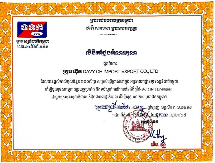 ស្របពេលជាមួយគ្នានោះដែរតំណាង ឯកឧត្តម ឃឹម វុទ្ធី អគ្គនាយកទូរទស្សន៍ជាតិកម្ពុជា បានធ្វើការឆ្លើយតប ថ្លែងអំណរគុណ និងសំដែងនូវការកោតសរសើរ ដល់លោកស្រី ជា ដាវី ម្ចាស់សិប្បកម្មក្រុមហ៊ុន ដាវីស៊ីអេច ចំពោះការផ្ដល់នូវសម្ភារប្រើប្រាស់ជាអាល់កុលទឹកទាំងនេះ ដែលជាកាយវិការមួយដ៏ល្អប្រពៃ និងថ្លៃថ្លាបំផុតដែលបានដើរតួនាទីដ៏សំខាន់សម្រាប់បម្រើការក្នុងអង្គភាព និងទុកប្រើប្រាស់ប្រចាំថ្ងៃស្របពេលបច្ចុប្បន្ន ជំងឺរាតត្បាតនៃជំងឺឆ្លងកូវីដ១៩ថ្មី JN.1កំពុងមានការីករាលដាល និងដើម្បីចូលរួមចំណែកលើកកម្ពស់សុវត្តិភាពសុខភាពសាធារណៈរបស់មន្រ្តីក្រោមឳវាត ផងដែរ៕