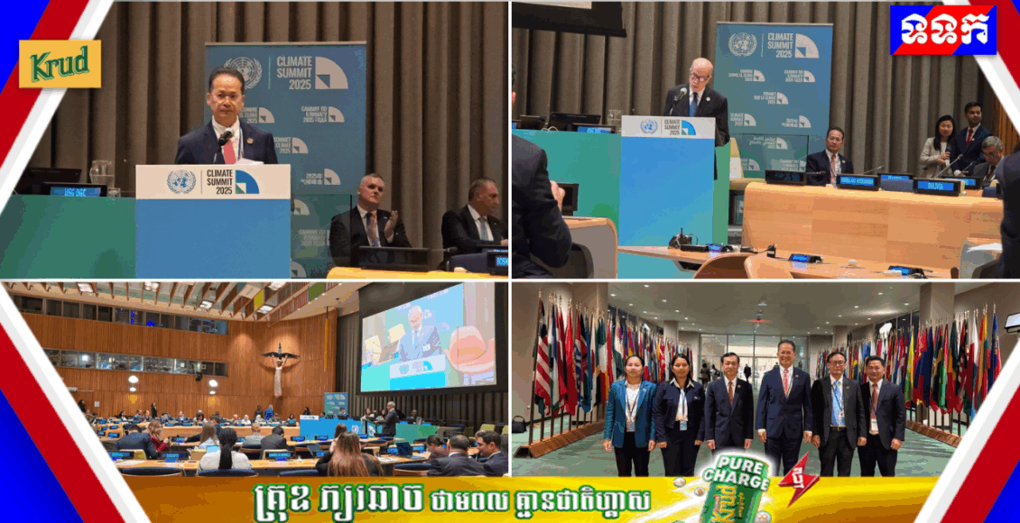 នាថ្ងៃទី២៤ ខែកញ្ញា ឆ្នាំទី២០២៥ នៅទីស្នាក់កណ្តាលអង្គការសហប្រជាជាតិនៅទីក្រុងញូយ៉ក សហរដ្ឋអាមេរិក ឯកឧត្តមបណ្ឌិត អ៊ាង សុផល្លែត រដ្ឋមន្ត្រីក្រសួងបរិស្ថាន តំណាងដ៏ខ្ពង់ខ្ពស់ សម្តេចមហាបរវរធិបតី ហ៊ុន ម៉ាណែត នាយករដ្ឋមន្ត្រីនៃព្រះរាជាណាចក្រកម្ពុជា បានសនិ្នសិទអាកាសធាតុ និងបានថ្លៃងបញ្ជាក់ អំពីគោលជំហររាជរដ្ឋាភិបាល ក្នុងការចូលរួមជាមួយសហគមន៍អន្តរជាតិប្រយុទ្ធប្រឆាំងនឹងការប្រែប្រួលអាកាសធាតុ ។