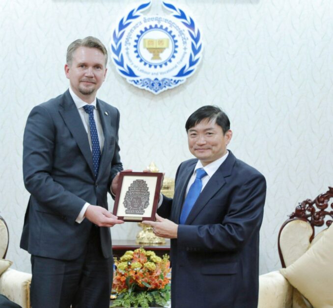 (ភ្នំពេញ)៖ ឯកឧត្តម ហេង សួរ រដ្ឋមន្ត្រីក្រសួងការងារ និងបណ្តុះបណ្តាលវិជ្ជាជីវៈ បានទទួលជួបសម្តែងការគួរសម និងពិភាក្សាការងារជាមួយលោក Cameron Baker ប្រធានគណៈកម្មការជំនាញនៃរដ្ឋអូស្ត្រាលីខាងត្បូង (South Australia-SA) ប្រទេសអូស្រ្តាលី ដើម្បីពង្រឹងកិច្ចសហប្រតិបត្តិការលើវិស័យបណ្តុះបណ្តាលបច្ចេកទេស និងវិជ្ជាជីវៈ ការផ្ដល់ឱកាសការងារ និងការចុះកម្មសិក្សាជំនាញដល់យុវជនកម្ពុជា។