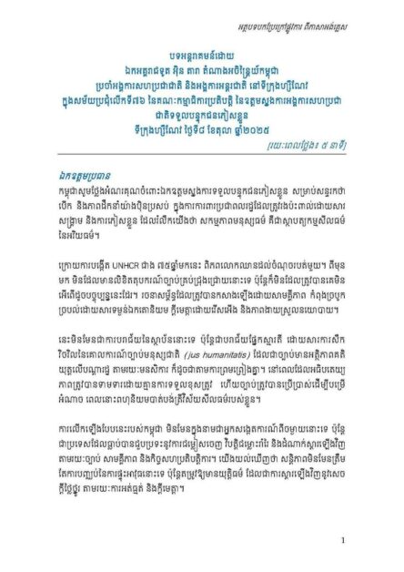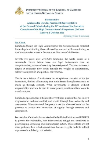 ទីក្រុងហ្ស៊ឺណែវ៖ នៅរសៀល ថ្ងៃទី៨ ខែតុលា ឆ្នាំ២០២៥ ឯកឧត្តម ឯកអគ្គរាជទូត អុិន តារា តំណាងអចិន្ត្រៃយ៍កម្ពុជា ប្រចាំអង្គការសហប្រជាជាតិ នៅទីក្រុងហ្សឺណែវ បានធ្វើបទអន្តរាគមន៍ ក្នុងអំឡុងកិច្ចពិភាក្សាទូទៅនៃសម័យប្រជុំលើកទី៧៦ នៃគណៈកម្មាធិការប្រតិបត្តិនៃកម្មវិធីឧត្តមស្នងការទទួលបន្ទុកជនភៀសខ្លួន (ExCom) (សេចក្តីថ្លែងការណ៍ភ្ជាប់ជាមួយ) ។