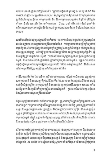 ឯកឧត្តម ឯកអគ្គរាជទូតក៏បានរំលឹកផងដែរថា គោលការណ៍នៃច្បាប់មនុស្សធម៌កំពុងត្រូវបានសាកល្បងនៅតាមព្រំដែនរបស់យើង ដែលការឈ្លានពានដោយប្រដាប់អាវុធបានធ្វើឱ្យជនស៊ីវិលផ្លាស់ទីលំនៅ បំផ្លាញផ្ទះសម្បែង ការបណ្តេញចេញដោយបង្ខំ ជាអាទិ៍។ ឥរិយាបទរបស់យើងនៅតែផ្អែកលើច្បាប់ មនុស្សជាតិ និងភាពអត់ធ្មត់ ជាភាពរឹងមាំដែលដឹកនាំដោយមនសិការ។