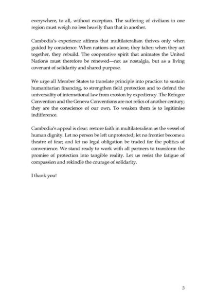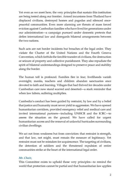 ក្នុងបទអន្តរាគមន៍ ឯកឧត្តម ឯកអគ្គរាជទូតបានគូសបញ្ជាក់អំពីផលវិបាកមនុស្សធម៌នៃជម្លោះប្រដាប់អាវុធដែលកំពុងបន្តរវាងកម្ពុជា និងថៃ ដោយបញ្ជាក់ថា កម្ពុជានិយាយពេលនេះមិនមែនក្នុងនាមជាអ្នកសង្កេតការណ៍ពីចម្ងាយនោះទេ ប៉ុន្តែជាប្រទេសមួយដែលបានស្គាល់ការផ្លាស់ទីលំនៅ និងការស្តារឡើងវិញតាមរយៈច្បាប់ សាមគ្គីភាព និងកិច្ចសហប្រតិបត្តិការ។ ឯកឧត្តម ឯកអគ្គរាជទូតបានសង្កត់ធ្ងន់ថា សន្តិភាពមិនមែនជាភាពស្ងៀមស្ងាត់នៃអាវុធទេ ប៉ុន្តែជាវត្តមាននៃយុត្តិធម៌ តាមការស្ដារឡើងវិញនូវសេចក្តីថ្លៃថ្នូរ តាមរយៈការអត់ធ្មត់ និងក្តីមេត្តា។