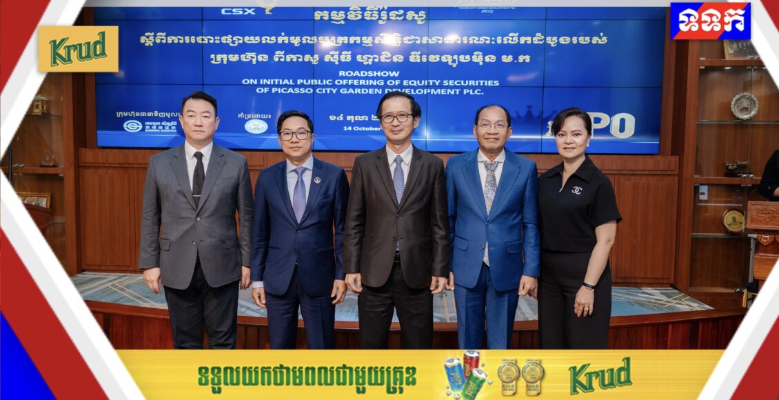 ឯឧត្តម ហុង សុហួរ ប្រតិភូរាជរដ្ឋាភិបាល ទទួលបន្ទុកជាអគ្គនាយក នៃផ្សារមូលបត្រកម្ពុជា ឯកឧត្តមបណ្ឌិត ហេង វុទ្ធី ប្រធានសមាគម វិនិយោគចិន នៅកម្ពុជា និងទីប្រឹក្សាសេដ្ឋកិច្ចសម្តេចធិបតី ហ៊ុន ម៉ាណែតនាយករដ្ឋមន្ត្រី នៃព្រះរាជាណាចក្រកម្ពុជា , ឯកឧត្តម សៀង ធីរិទ្ធ អគ្គនាយករង នៃនិយ័តករមូលបត្រកម្ពុជា និងលោក Teng, Cheng-Yueh ប្រធានក្រុមប្រឹក្សាភិបាល នៃក្រុមហ៊ុន ខេមបូឌា ស៊ីឃ្យូរឹធី នៅថ្ងៃទី១៤ ខែតុលា ឆ្នាំ២០២៥ បានអញ្ជើញអធិបតីក្នុងពិធីប្រកាសបើក “កម្មវិធីរ៉ូដសូ ស្តីពីការបោះផ្សាយលក់មូលបត្រកម្ម សិទ្ធិជាសាធារណៈលើកដំបូងរបស់ ក្រុមហ៊ុន ពីកាសូ ស៊ីធី ហ្គាដិន ឌីវេឡុបមិន ម.ក” នៅផ្សារមូលបត្រកម្ពុជា (ផមក) ។