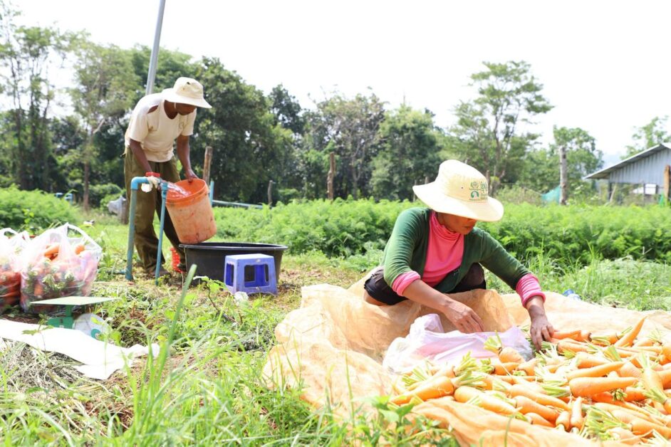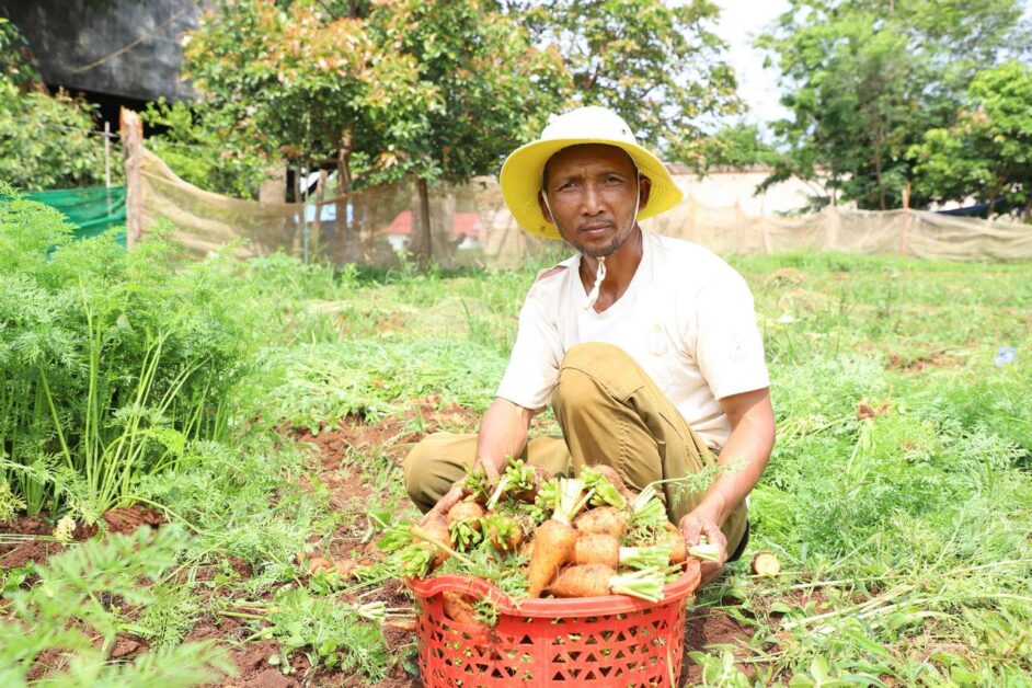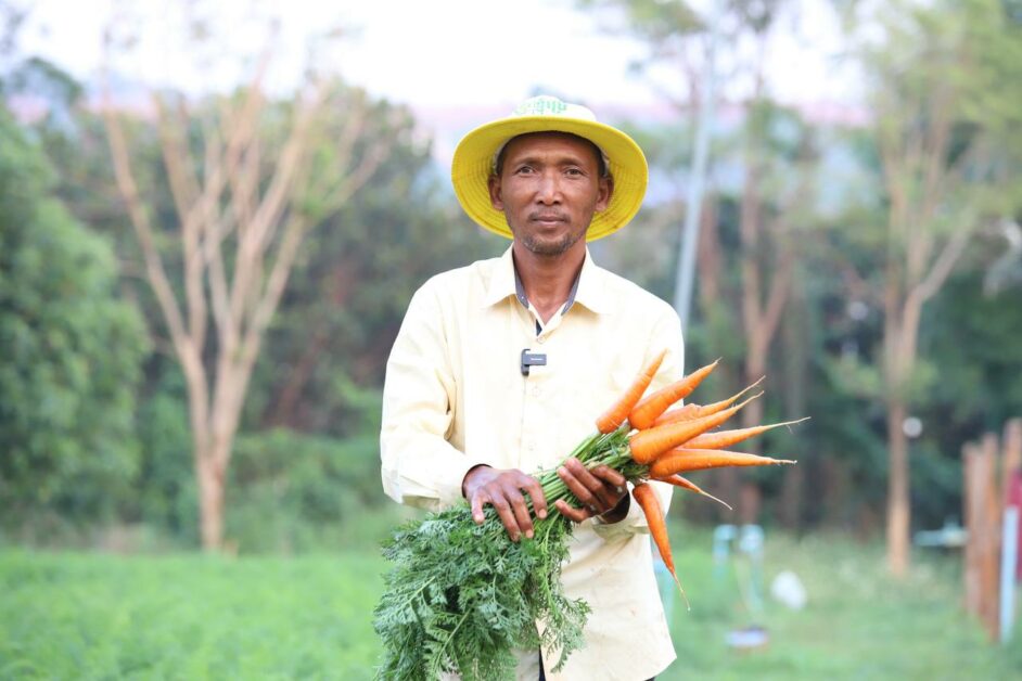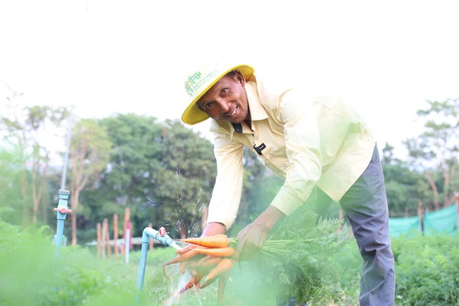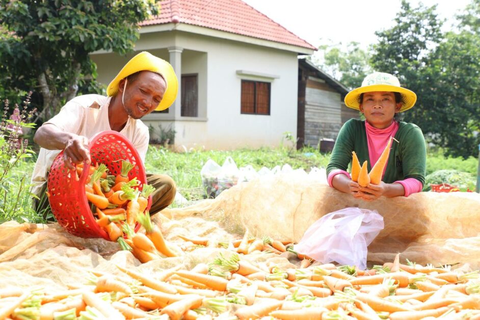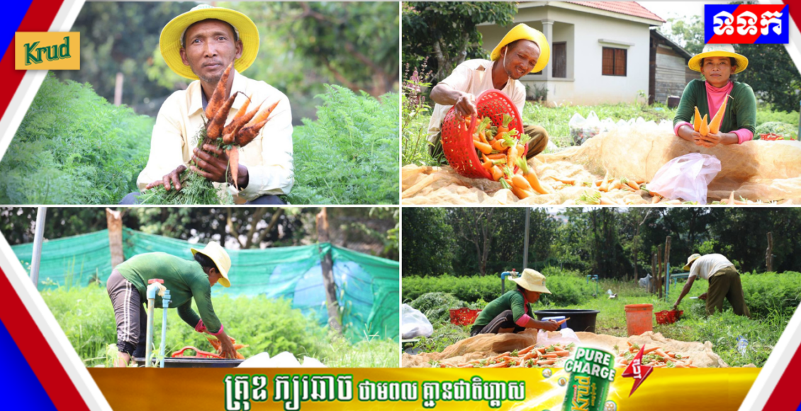 កសិករដាំបន្លែសុវត្ថិភាព សប្បាយរីករាយ ក្នុងការប្រមូលផលដំណាំបន្លែ (មើមការ៉ុត) ដែលទទួលបានទិន្នផលខ្ពស់ និងមានតម្លៃសមរម្យ