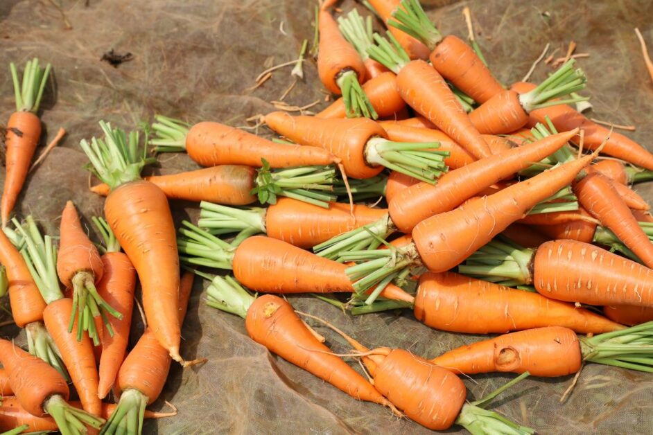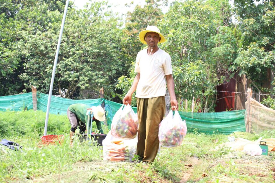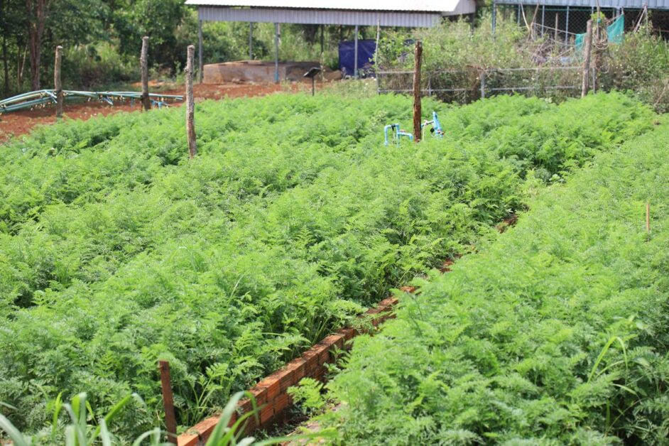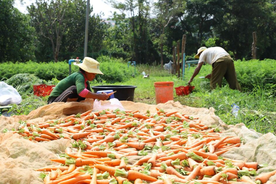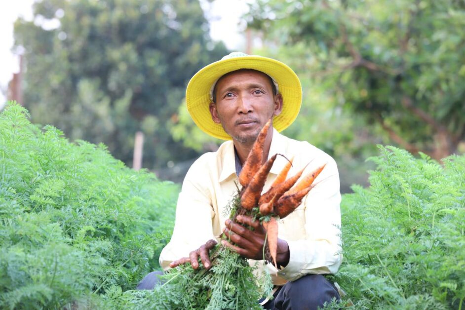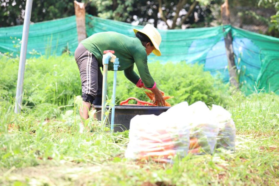 កសិករដាំបន្លែសុវត្ថិភាព សប្បាយរីករាយ ក្នុងការប្រមូលផលដំណាំបន្លែ (មើមការ៉ុត) ដែលទទួលបានទិន្នផលខ្ពស់ និងមានតម្លៃសមរម្យ