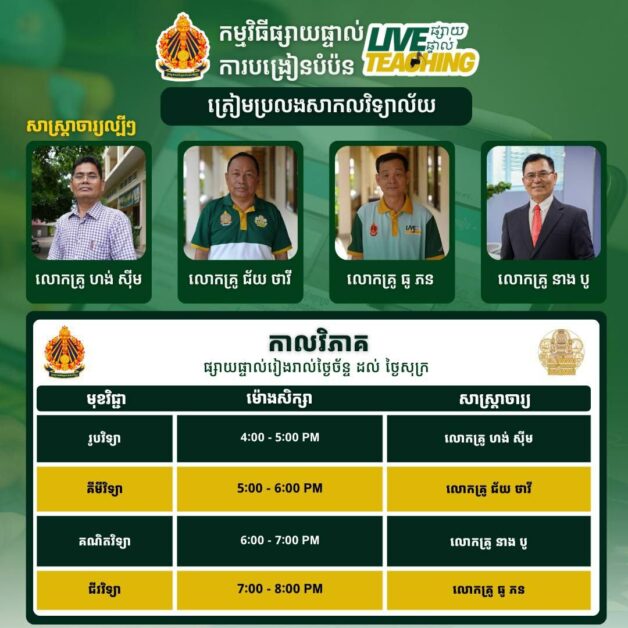 ឯកឧត្តមបណ្ឌិត សាន វឌ្ឍនា បានបញ្ជាក់ថា កម្មវិធីបង្រៀនតាមប្រព័ន្ធសមកាលកម្ម ឬការបង្រៀនដោយការផ្សាយបន្តផ្ទាល់ (Live Teaching) នឹងមានជារៀងរាល់ថ្ងៃច័ន្ទដល់ថ្ងៃសុក្រ លើមុខវិជ្ជាដូចខាងក្រោម ៖