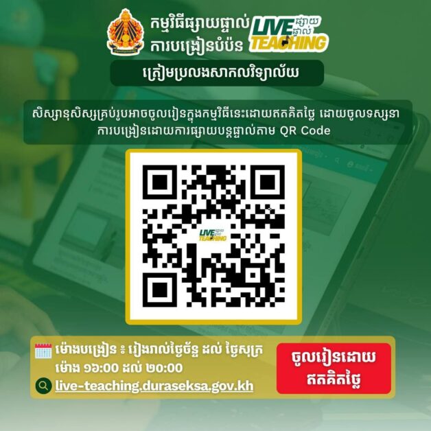 សូមបញ្ជាក់ថា សិស្សានុសិស្សគ្រប់រូបអាចចូលរៀនក្នុងកម្មវិធីនេះដោយឥតគិតថ្លៃ ដោយចូលទស្សនាការបង្រៀនដោយការផ្សាយបន្តផ្ទាល់តាម https://live-teaching.duraseksa.gov.kh ឬស្កេនលើ QR Code។ ក្នុងអំឡុងពេលនៃការរៀន សិស្សដែលមានចម្ងល់អាចសាកសួរដោយផ្ទាល់ទៅកាន់សាស្រ្តាចារ្យ ហើយចម្ងល់ទាំងនោះនឹងទទួលបានការស្រាយបំភ្លឺតបជូនទៅកាន់សិស្សានុសិស្សវិញ។ ក្រៅពីការបង្រៀនដោយការផ្សាយបន្តផ្ទាល់ពីសំណាក់សាស្រ្តាចារ្យទាំង៤រូបនេះ មជ្ឈមណ្ឌលសម្រាប់ការអប់រំឌីជីថល និងការអប់រំពីចម្ងាយក៏នឹងអញ្ជើញនិស្សិតឆ្នាំទី១នៃសាកលវិទ្យាល័យ ដែលទើបប្រឡងចូលរៀនដោយជោគជ័យកាលពីឆ្នាំមុន មកចែករំលែកបទពិសោធន៍ស្តីពីការប្រឡង និងការត្រៀមខ្លួនដើម្បីប្រឡងឱ្យបានជោគជ័យ។