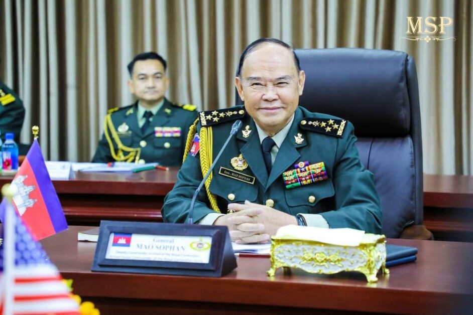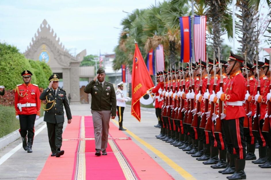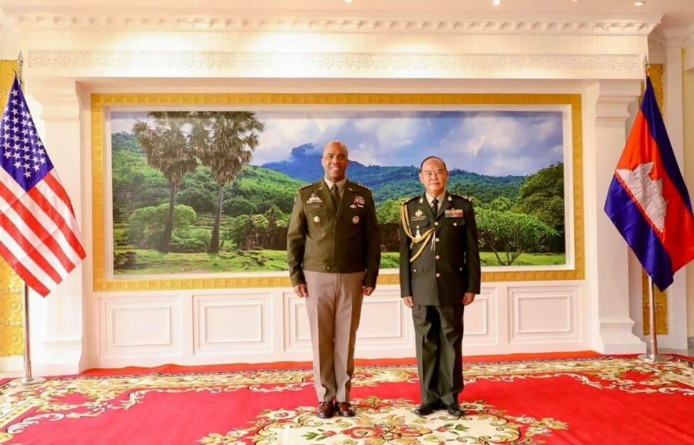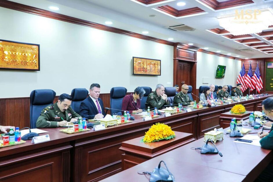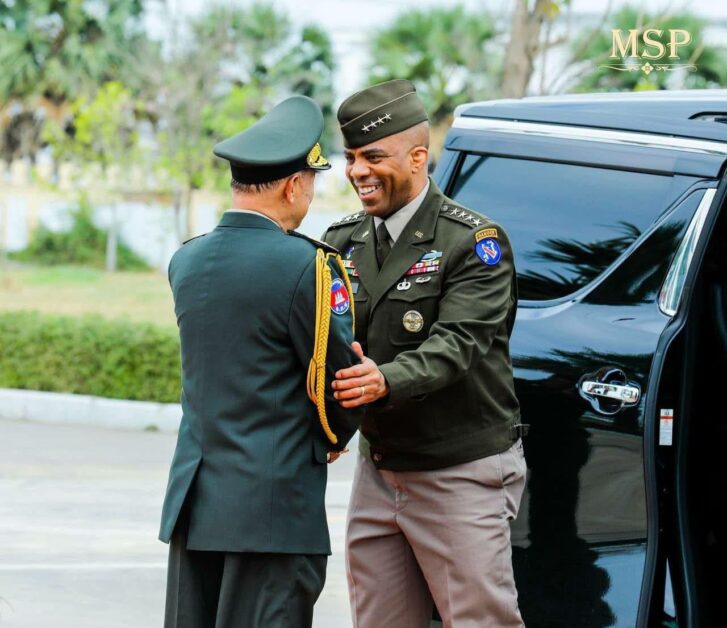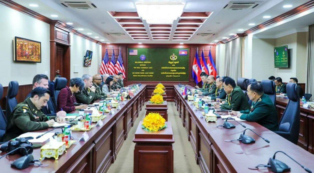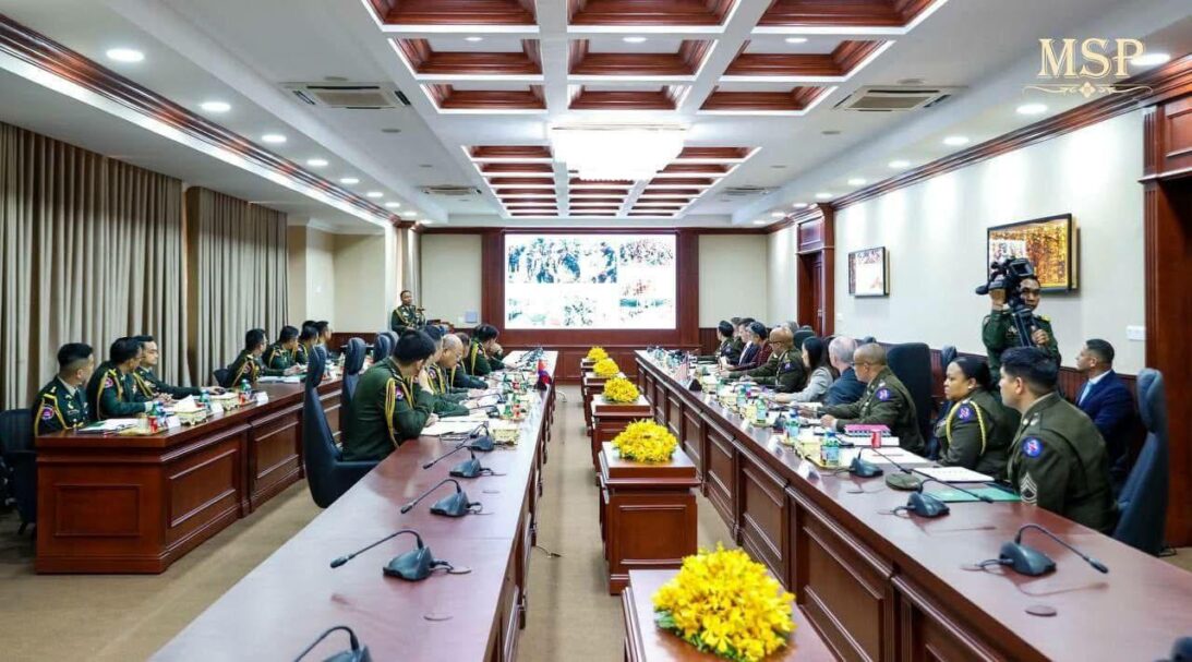 កិច្ចប្រជុំទ្វេភាគី រវាងកងទ័ពជើងគោកនៃកងយោធពលខេមរភូមិន្ទ ជាមួយនឹងកងទ័ពជើងគោកសហរដ្ឋអាមេរិកប្រចាំប៉ាស៊ីហ្វិក ដែលភាគីកម្ពុជាដឹកនាំដោយឯកឧត្តម នាយឧត្តមសេនីយ៍ ម៉ៅ សុផាន់ អគ្គមេបញ្ជាការរង កងយោធពលខេមរភូមិន្ទ និងជាមេបញ្ជាការកងទ័ពជើងគោក និងភាគីអាមេរិកដឹកនាំដោយ ឯកឧត្តម នាយឧត្តមសេនីយ៍ រ៉ូណាល់ ខ្លែក មេបញ្ជាការកងទ័ពជើងគោក US ប្រចាំប៉ាស៊ីហ្វិក នៅព្រឹកថ្ងៃទី ២៤ ខែកុម្ភៈ ឆ្នាំ ២០២៥។