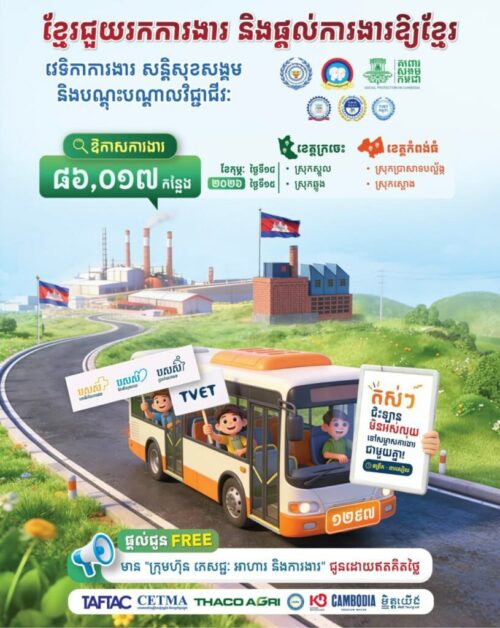ភ្នំពេញ ៖ នៅថ្ងៃទី១៤-១៥ ខែកុម្ភៈ ឆ្នាំ២០២៦ ខាងមុខនេះ ក្រសួងការងារ និងបណ្តុះបណ្តាលវិជ្ជាជីវៈ នឹងនាំយកឱកាសការងារ ៨៦០១៧ កន្លែងសម្រាប់អតីតពលករត្រឡប់ពីប្រទេសថៃ យុវជន និងអ្នកកំពុងស្វែងរកការងារធ្វើក្នុងខេត្ដក្រចេះ និងកំពង់ធំ។