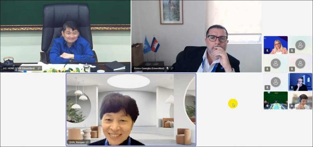 ឯកឧត្តម ហេង សួរ រដ្ឋមន្ត្រីក្រសួងការងារ និងបណ្តុះបណ្តាលវិជ្ជាជីវៈបានទទួលជួបពិភាក្សាការងារជាមួយ លោកស្រី Xiaoyan Qian នាយិកាការិយាល័យអង្គការអន្តរជាតិខាងការងារ (ILO) ប្រចាំប្រទេសថៃ កម្ពុជា និងឡាវ និងតំណាងទីភ្នាក់ងារអង្គការសហប្រជាជាតិ តាមប្រព័ន្ធអនឡាញ នារសៀលថ្ងៃទី២៤ ខែវិច្ឆិកា ឆ្នាំ២០២៥ ដើម្បីពិភាក្សាស្វែងយល់អំពីវឌ្ឍនភាព និងទិសដៅសម្រាប់ការអនុវត្តផែនទីបង្ហាញផ្លូវរបស់កម្ពុជាសម្រាប់កាតាលិករសកលស្តីពីការងារសមរម្យ និងការគាំពារសង្គមសម្រាប់អន្តរកាលយុត្តិធម៌ (ក.ផ.ក.អ.)។