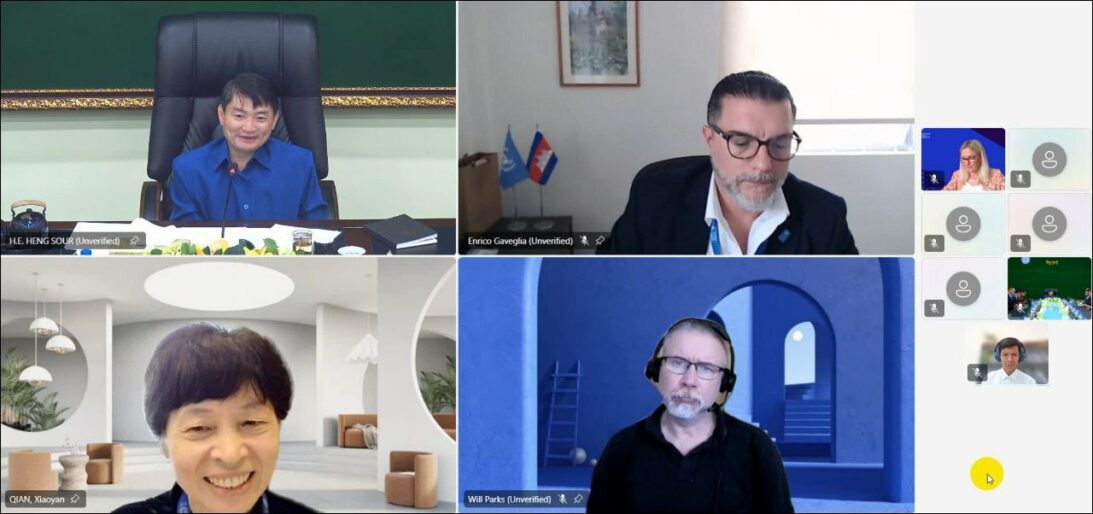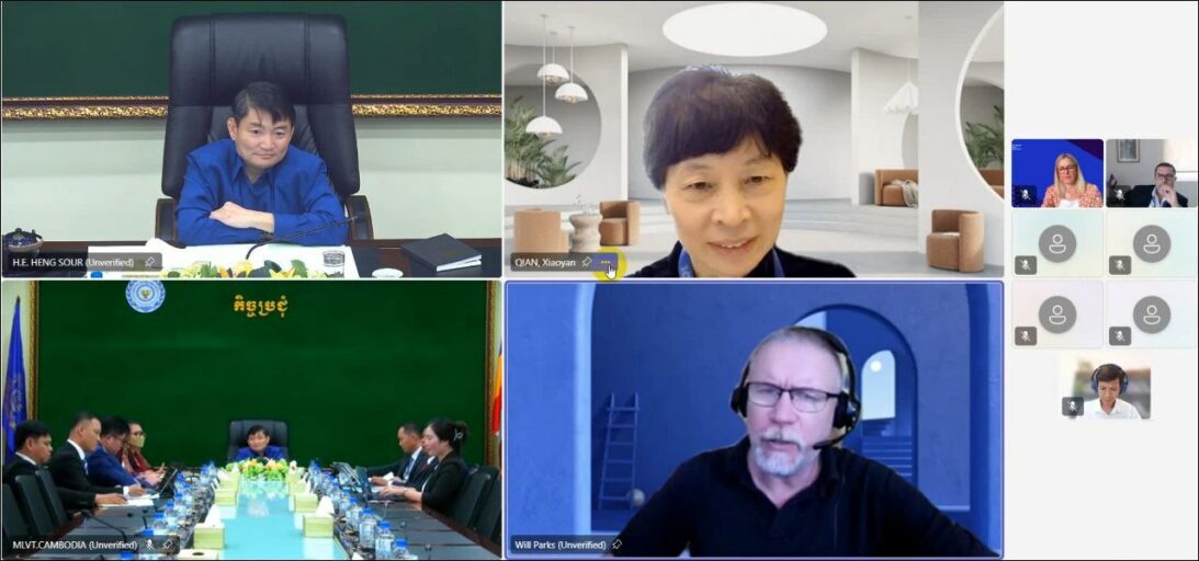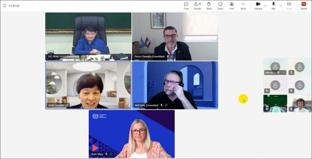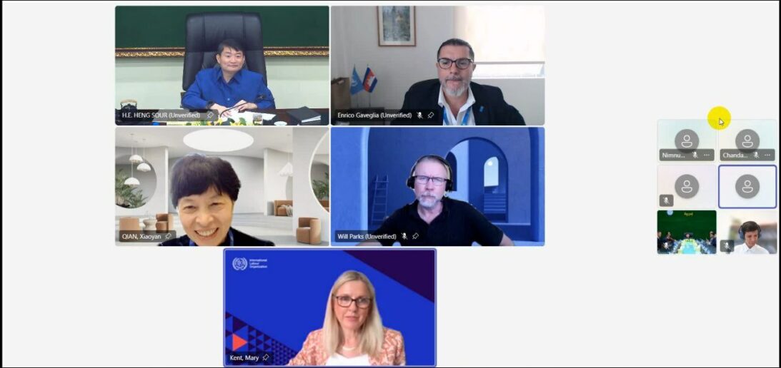 ឯកឧត្តម ហេង សួរ រដ្ឋមន្ត្រីក្រសួងការងារ និងបណ្តុះបណ្តាលវិជ្ជាជីវៈបានទទួលជួបពិភាក្សាការងារជាមួយ លោកស្រី Xiaoyan Qian នាយិកាការិយាល័យអង្គការអន្តរជាតិខាងការងារ (ILO) ប្រចាំប្រទេសថៃ កម្ពុជា និងឡាវ និងតំណាងទីភ្នាក់ងារអង្គការសហប្រជាជាតិ តាមប្រព័ន្ធអនឡាញ នារសៀលថ្ងៃទី២៤ ខែវិច្ឆិកា ឆ្នាំ២០២៥ ដើម្បីពិភាក្សាស្វែងយល់អំពីវឌ្ឍនភាព និងទិសដៅសម្រាប់ការអនុវត្តផែនទីបង្ហាញផ្លូវរបស់កម្ពុជាសម្រាប់កាតាលិករសកលស្តីពីការងារសមរម្យ និងការគាំពារសង្គមសម្រាប់អន្តរកាលយុត្តិធម៌ (ក.ផ.ក.អ.)។