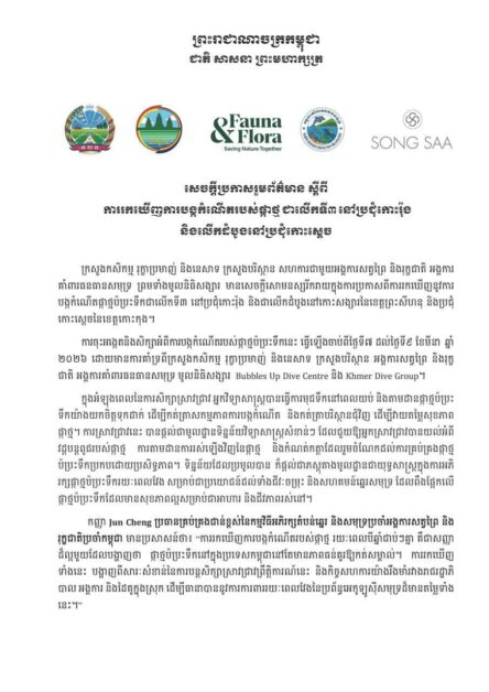 ភ្នំពេញ ៖ ក្រសួងកសិកម្ម រុក្ខាប្រមាញ់ និងនេសាទ ក្រសួងបរិស្ថាន សហការជាមួយអង្គការសត្វព្រៃ និងរុក្ខជាតិ អង្គការ គាំពារធនធានសមុទ្រ ព្រមទាំងមូលនិធិសង្សារ មានសេចក្តីសោមនស្សរីករាយក្នុងការប្រកាសពីការរកឃើញនូវការ បង្កកំណើតផ្កាថ្មប៉ប្រះទឹកជាលើកទី៣ នៅប្រជុំកោះរ៉ុង និងជាលើកដំបូងនៅកោះសង្សារនៃខេត្តព្រះសីហនុ និងប្រជុំ កោះស្ដេចនៃខេត្តកោះកុង។