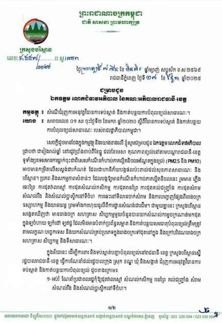 ភ្នំពេញ ៖ ក្រសួងបរិស្ថាន បានពង្រឹងកិច្ចសហប្រតិបត្តិការជាមួយរដ្ឋបាលរាជធានីនិងខេត្តទូទាំងប្រទេស ចូលរួមពង្រឹងការអនុវត្តវិធានការទប់ស្កាត់ និងកាត់បន្ថយការបំពុលខ្យល់សាធារណៈ ដោយប្រកាសដល់ពលរដ្ឋ រួមទាំងរោងចក្រសហគ្រាស មិនឱ្យដុតសំណល់ប្លាសិ្ទត ឬកម្ទេចកំណាត់ ចាប់ពីខែធ្នូ ឆ្នាំ២០២៥ រហូតដល់ខែមេសា ឆ្នាំ២០២៦។