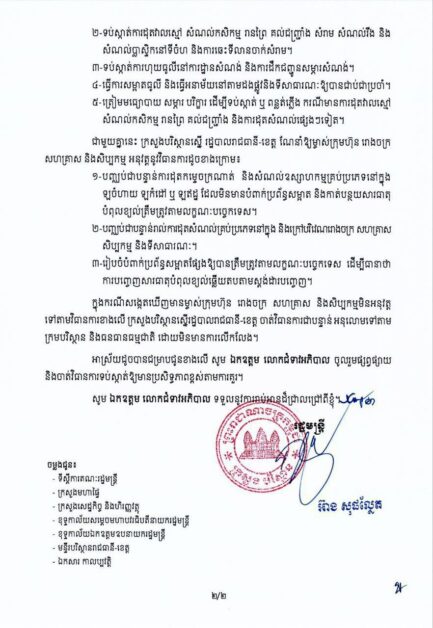 ២- បញ្ឈប់រាល់ការដុតសំណល់គ្រប់ប្រភេទនៅក្នុង និងក្រៅបរិវេណរោងចក្រ សហគ្រាស សិប្បកម្ម និងទីសាធារណៈ។