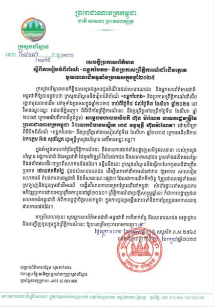 ភ្នំពេញ៖ ចាប់ពីថ្ងៃទី៥ដល់ថ្ងៃទី៧ ខែសីហា ឆ្នាំ២០២៥ ក្រសួងបរិស្ថាន នឹងរៀបចំ ពិព័រណ៍ «ពន្លកបៃតង» និងការប្រកាសព្រឹត្តិការណ៍ដាំដើមត្នោតមួយលានដើមទូទាំងប្រទេសក្នុងឆ្នាំ២០២៥ ក្រសួងបរិស្ថាន ក៏មានចែកកូនឈើជាច្រើនប្រភេទដោយឥតគិតថ្លៃ។ កម្មវិធីនេះនឹងធ្វើទ្បើង នៅវិមានឈ្នះ-ឈ្នះ។
