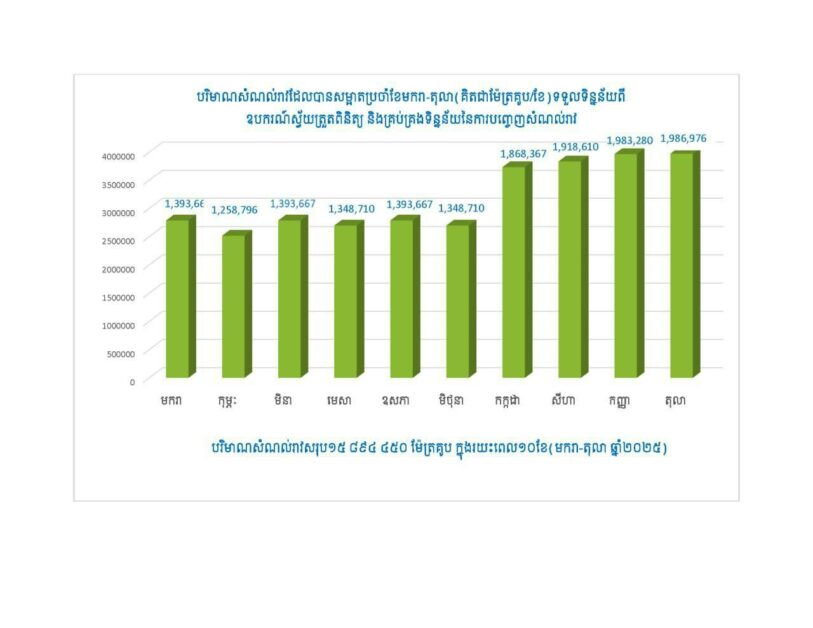 ភ្នំពេញ៖ ចាប់ពីខែមករា រហូតដល់ខែតុលា ឆ្នាំ២០២៥ គឺមានរយៈពេល១០ខែ ក្រសួងបរិស្ថាន បានទប់ស្កាត់ការបញ្ចេញសំណល់រាវបំពុលបរិស្ថានពីរោងចក្រ សហគ្រាសនិងក្រុមហ៊ុននានា ស្របតាមវិធានការច្បាប់បានចំនួន ១៥ ៨៩៤ ៤៥០ ម៉ែត្រគូប។