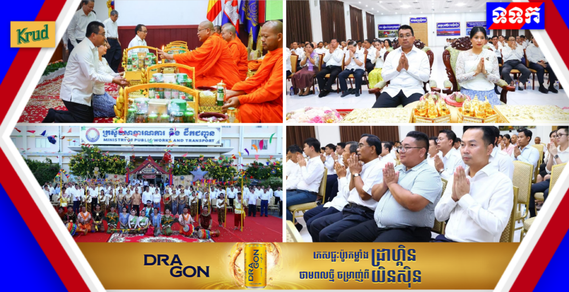 ទីស្តីការក្រសួង៖ នារសៀលថ្ងៃចន្ទ ទី៦ ខែមេសា ឆ្នាំ២០២៦ ឯកឧត្តម ប៉េង ពោធិ៍នា រដ្ឋមន្ត្រីក្រសួងសាធារណការ និងដឹកជញ្ជូន និងលោកជំទាវ បានអញ្ជើញជាអធិបតីក្នុងពិធីចម្រើនព្រះបរិត្តប្រសិទ្ធពរជ័យ សិរីជ័យមង្គល ជូនថ្នាក់ដឹកនាំ និងបុគ្គលិកមន្ត្រីរាជការ នៃក្រសួងសាធារណការ និងដឹកជញ្ជូន នៅក្នុងឱកាសនៃពិធីបុណ្យចូលឆ្នាំថ្មី ប្រពៃណីជាតិខ្មែរ ឆ្នាំមមី អដ្ឋស័ក ពុទ្ធសករាជ ២៥៧០ ដោយមានការអញ្ជើញចូលរួមពីសំណាក់ ឯកឧត្តម លោកជំទាវ ជាថ្នាក់ដឹកនាំ ព្រមទាំងបុគ្គលិក មន្ត្រីរាជការក្រោមឱវាទក្រសួងគ្រប់លំដាប់ថ្នាក់ជាច្រើនរូបផងដែរ។