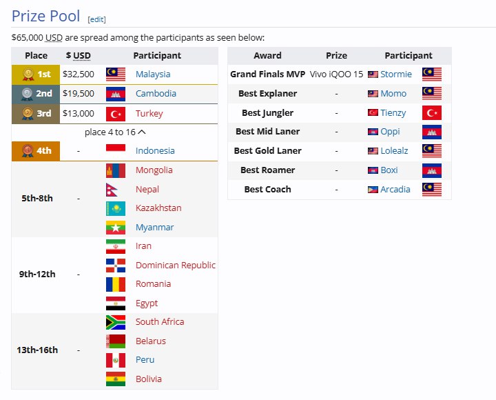 វិញ្ញាសា MLBB ផ្នែកបុរសមានក្រុមជម្រើសជាតិ ១៦ ដែលជម្រុះពីក្រុមតំបន់ចូលរួមប្រកួត ខណៈ ក្រុមជម្រើសជាតិនារីមាន ១២ ក្រុមចូលរួមប្រកួត។