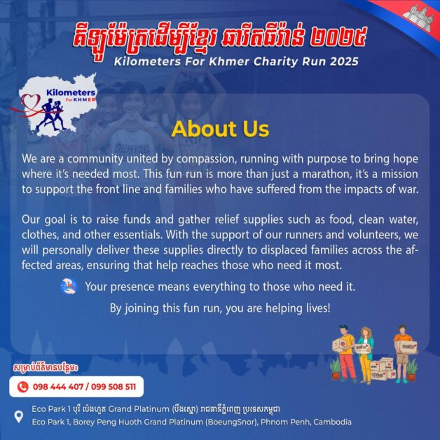 នាព្រឹកថ្ងៃអាទិត្យ ទី៥ ខែតុលា ឆ្នាំ២០២៥, ក្រុមគីឡូម៉ែត្រដើម្បីខ្មែរ បានរៀបចំនូវ កម្មវិធីរត់ ដើម្បីសប្បុរសធម៌ នៅបុរីប៉េងហួត គម្រោងអេកូផាក ១ រាជធានីភ្នំពេញ, ក្នុងគោលបំណងបង្ហាញនូវស្មារតីសាមគ្គីភាព ដើម្បីសន្តិភាព និងមោទនភាពជាតិ ព្រមទាំងកៀរគរជំនួយមនុស្សធម៌ ជួយដល់ជនភៀសសឹក ដែលរងគ្រោះដោយសារសង្រ្គាម។