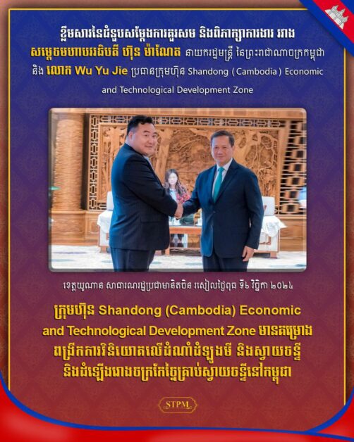 នារសៀល ថ្ងៃទី៦ ខែវិច្ឆិកា ឆ្នាំ២០២៤ សម្តេចមហាបវរធិបតី ហ៊ុន ម៉ាណែត នាយករដ្ឋមន្រ្តី នៃព្រះរាជាណាចក្រកម្ពុជា បានអនុញ្ញាតឱ្យ លោក Wu Yu Jie ប្រធានក្រុមហ៊ុន Shandong (Cambodia) Economic and Technological Development Zone និងសហការី ចូលជួបសម្តែងការគួរសម និងពិភាក្សាការងារ ក្នុងឱកាសអញ្ជើញចូលរួមកិច្ចប្រជុំកំពូលមហាអនុតំបន់មេគង្គ (GMS) លើកទី៨ នៅថ្ងៃទី៦-៧ ខែវិច្ឆិកា ឆ្នាំ២០២៤ នៅទីក្រុងគុនមិញ ខេត្តយូណាន សាធារណរដ្ឋប្រជាមានិតចិន។