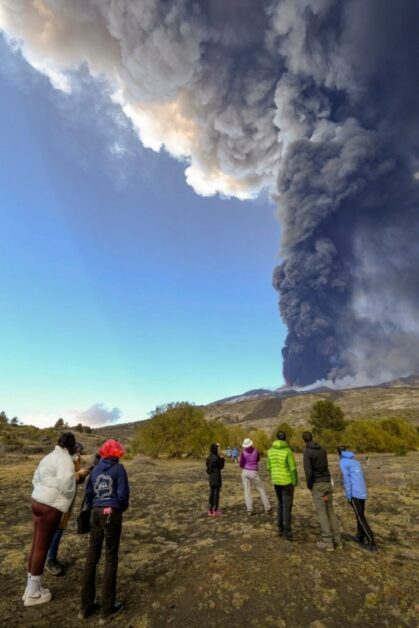 ក្រុមអ្នកស្រុក-ភ្ញៀវទេសចរហាក់ស្រឡាំងកាំងនៅពេលបានឃើញ ដោយផ្ទាល់នូវសកម្មភាពបង្ហុយផ្សែងផេះរបស់ភ្នំភ្លើង Etna ក្នុងប្រទេសអ៊ីតាលី