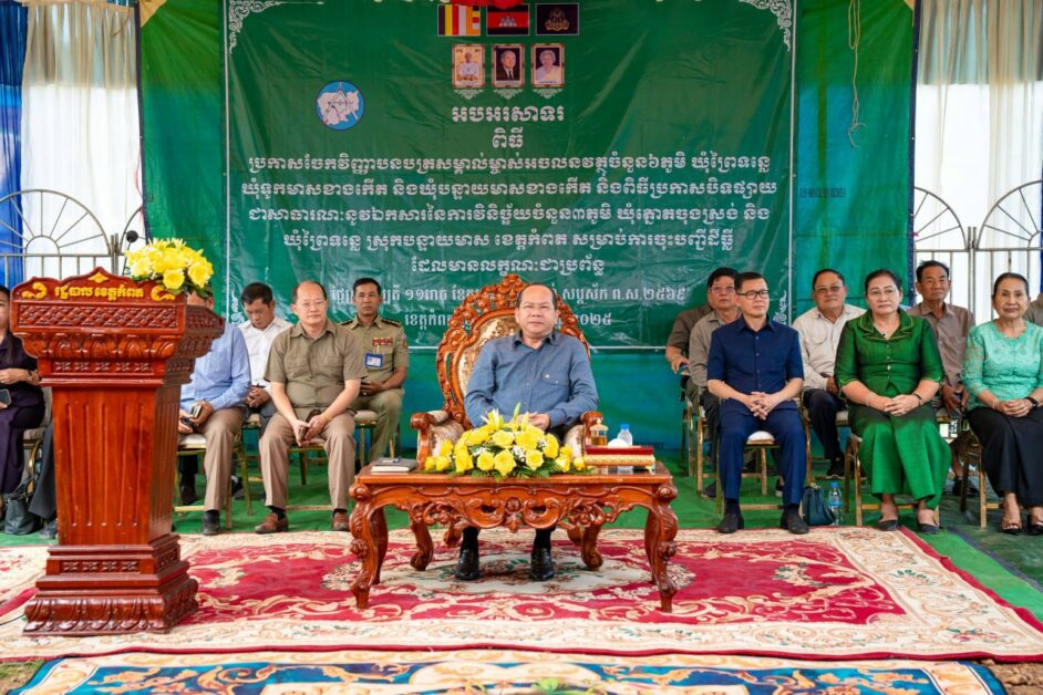 ក្នុងពិធីនេះដែរ ឯកឧត្តម ម៉ៅ ធនិន អភិបាលខេត្តកំពត បានគូសបញ្ជាក់ថា បណ្ណកម្មសិទ្ធិដីធ្លីដែលចេញជូនបងប្អូននាពេលនេះ គឺជាកេរ្តិ៍មរតកដ៏សំខាន់មួយរបស់ប្រមុខថ្នាក់ដឹកនាំ គឺសម្តេចតេជោ ហ៊ុន សែន និងសម្តេចធិបតី ហ៊ុន ម៉ាណែត នាយករដ្ឋមន្ត្រីនៃកម្ពុជា ដែលសម្តេចទាំងទ្វេរបានដាក់ចេញនូវគោលនយោបាយដីធ្លីសម្រាប់ពលរដ្ឋ ការចង្អុលបង្ហាញដោយផ្ទាល់មកកាន់អាជ្ញាធររាជធានី-ខេត្ត ពិសេសមន្ទីរជំនាញធ្វើយ៉ាងណាពន្លឿនការចេញបណ្ណកម្មសិទ្ធិជូនពលរដ្ឋឱ្យបានឆាប់បំផុត ដើម្បីទាញយកប្រយោជន៍ពីដីធ្លី។ ឯកឧត្តមអភិបាលខេត្តក៏បានក្រើនរំលឹក និងស្នើដល់ពលរដ្ឋដែលបានទទួលបណ្ណកម្មសិទ្ធិរួចហើយ សូមកុំឱ្យកើតមានវិវាទដីធ្លី ព្រោះការដោះស្រាយស្ថិតនៅលើប្រព័ន្ធតុលាការ មិនអាចសម្របសម្រួល ឬដោះស្រាយវិវាទក្រៅប្រព័ន្ធតុលាការ ដោយគណៈកម្មការដីរដ្ឋបាននោះទេ។