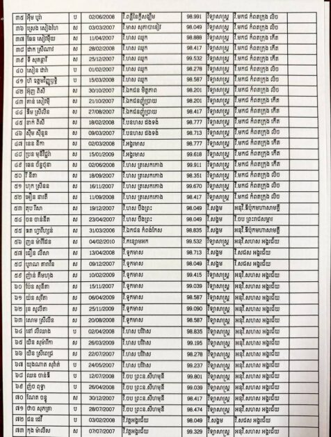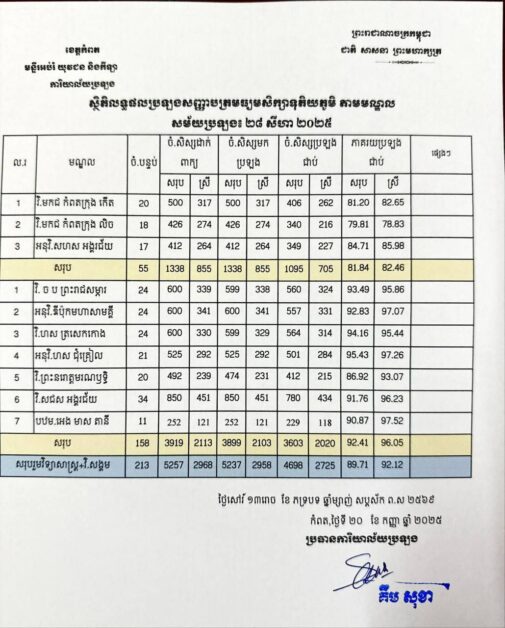 នៅក្នុងតារាងស្ថិតិលទ្ធផលនោះ ក៏បានបញ្ជាក់ដែរថា ខេត្តកំពតមានសិស្សប្រឡងជាប់សរុប ចំនួន ៤.៦៩៨នាក់ ស្រី ២.៧២៥នាក់ ស្នើ ៩០.៨៥% ក្នុងនោះអត្រាសិស្សប្រុស ប្រឡងជាប់ ៨៩.៧% និងសិស្សស្រីជាប់ ៩២.១២%។