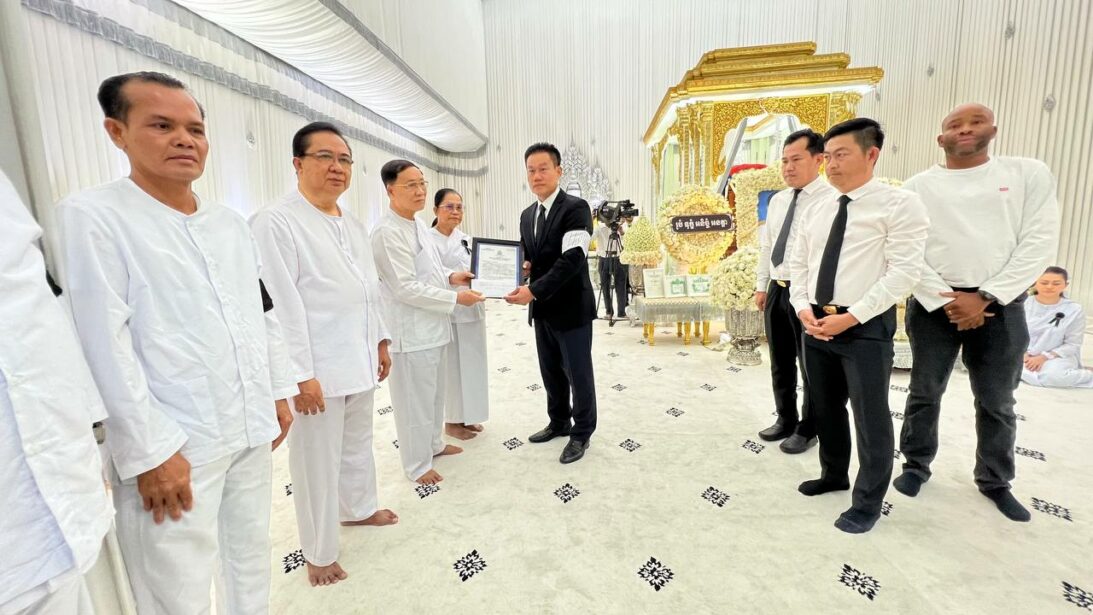 ក្នុងវេលាដ៏ក្រៀមក្រំនេះ ឯកឧត្តមនាយឧត្តមសេនីយ៍ ឈន សារ៉ាណេ និងគណៈប្រតិភូ បានធ្វើការលំឱនកាយចិត្តគោរពវិញាណក្ខន្ធ និងបានលើកហត្ថប្រណមឧទ្ទិសបួងសួងដល់គុណបុណ្យព្រះរតនត្រ័យ វត្ថុស័ក្តិសិទ្ធិទាំងឡាយក្នុងលោក ជួយដឹកនាំដួងវិញ្ញាណក្ខន្ធសព ឯកឧត្តមអ្នកឧកញ៉ា ឧត្តមមេត្រីវិសិដ្ឋ ហ៊ុន សាន បានទៅសោយសុខក្នុងឋានសុគតិភពកុំបីឃ្លៀងឃ្លាតឡើយ៕