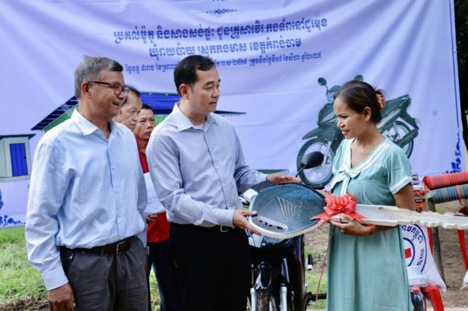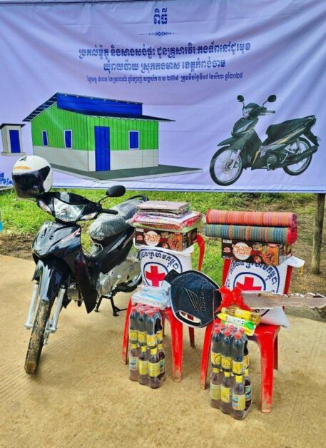 ម៉ូតូ ១គ្រឿង សម្ភារៈបរិក្ខារ គ្រឿងឧបភោគបរិភោគ និងថវិកាមួយចំនួន។ ទន្ទឹមនោះ គម្រោងផ្ទះថ្មី ១ខ្នង និងបង្គន់អនាម័យ ១បន្ទប់ ក៏ត្រូវបានចាប់ចាក់គ្រឹះព្រមគ្នាផងដែរ ដែលតាមមេជាងបានបញ្ជាក់ថា សំណង់នេះនឹងសាងសង់រួចរាល់នៅដើមខែក្រោយ