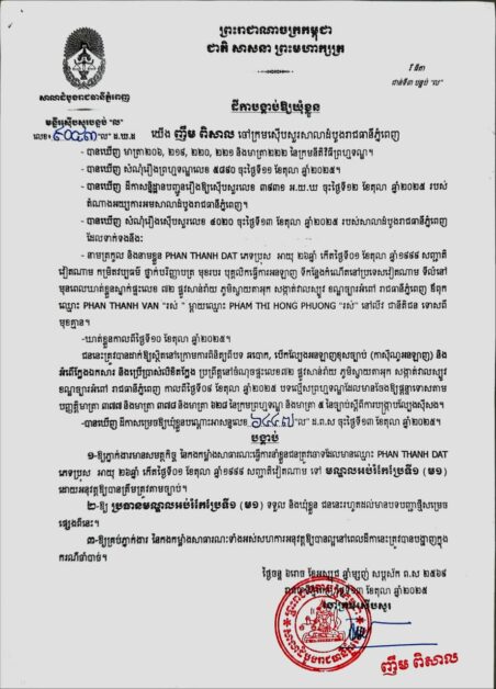 ភ្នំពេញ៖ លោក ញឹម ពិសាល ចៅក្រមស៊ើបសួរ សាលាដំបូងរាជធានីភ្នំពេញ នៅថ្ងៃទី១៤ ខែតុលា ឆ្នាំ២០២៥នេះ បានចេញដីកាចំនួន២ផ្សេងគ្នាដោយបានបង្គាប់ឱ្យឃុំខ្លួនបុរសជនជាតិវៀតណាមចំនួន២នាក់នៅមណ្ឌលអប់រំកែប្រែទី១ “ម១” ។