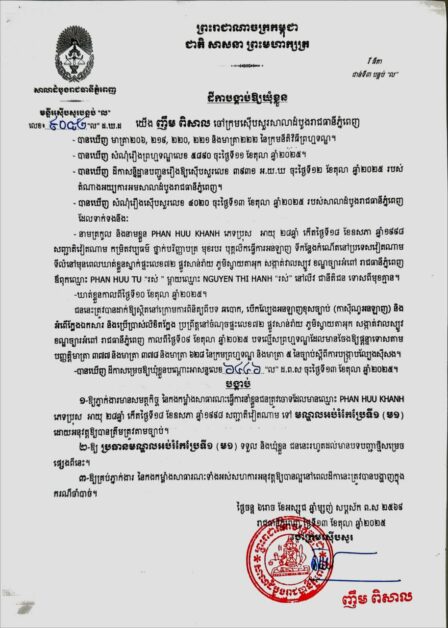 តុលាការរាជធានីភ្នំពេញបានបង្គាប់ឱ្យឃុំខ្លួនជនជាតិវៀតណាមចំនួន២នាក់ពីបទបើកល្បែងអនឡាញខុសច្បាប់ និង អំពើក្លែងឯកសារ និងប្រើប្រាស់លិខិតក្លែង