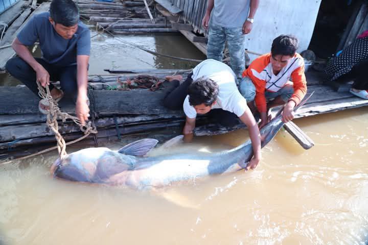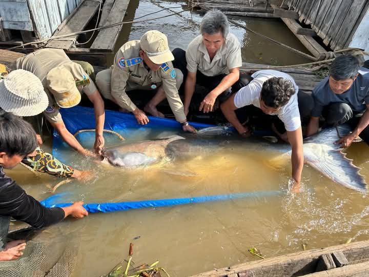 ត្រីរាជមួយក្បាល ទម្ងន់១៣២គីឡូក្រាម ដែលចាប់បានដោយអ្នកនេសាទ ទទួលបានការជួយសង្គ្រោះ និងលែងចូលបឹងធម្មជាតិវិញ