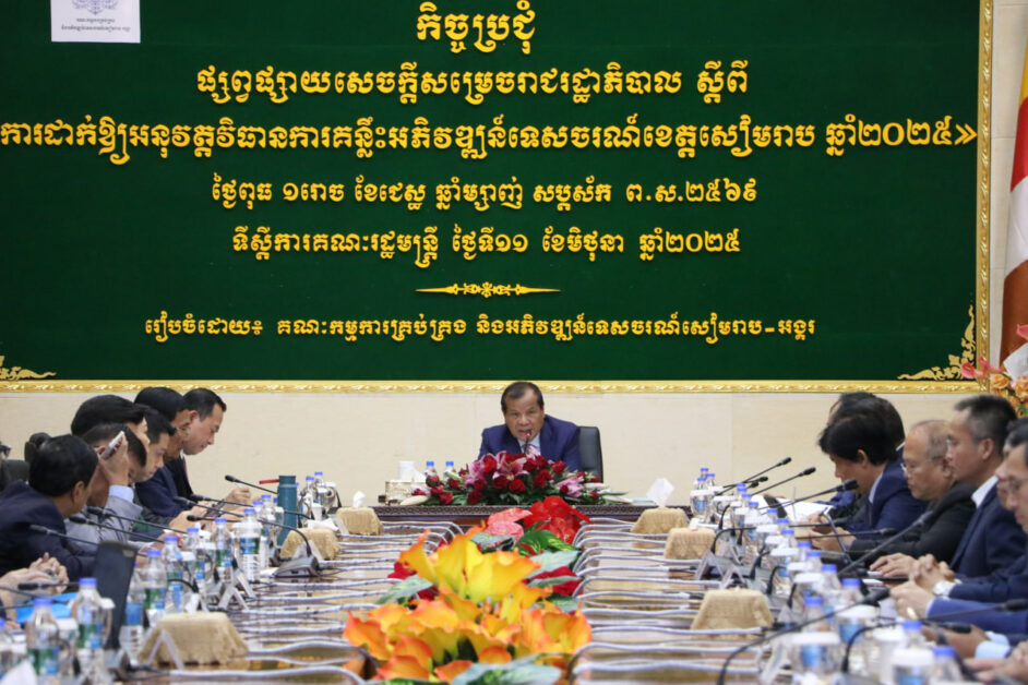 នាថ្ងៃទី១១ ខែមិថុនា ឆ្នាំ២០២៥ ឯកឧត្តម ថោង ខុន ទេសរដ្ឋមន្ត្រី និងជាប្រធានគណៈកម្មការគ្រប់គ្រង និងអភិវឌ្ឍន៍ទេសចរណ៍សៀមរាប-អង្គរ (គ.អ.ទ.ស.) បានអញ្ជើញជាអធិបតីក្នុងកិច្ចប្រជុំគណៈកម្មការគ្រប់គ្រង និងអភិវឌ្ឍន៍ទេសចរណ៍សៀមរាប-អង្គរ ដើម្បីផ្សព្វផ្សាយ “សេចក្តីសម្រេចស្តីពីការអនុវត្តវិធានការគន្លឹះអភិវឌ្ឍន៍ទេសចរណ៍ខេត្តសៀមរាបឆ្នាំ២០២៥”នៅទីស្ដីការគណៈរដ្ឋមន្រ្តី ដោយមានការអញ្ជើញចូលរួមពី ឯកឧត្តមរដ្ឋមន្ត្រីក្រសួងទេសចរណ៍ និងជាអនុប្រធានអចិ ន្ត្រៃ គ.អ.ទ.ស., ឯកឧត្តម លោកជំទាវជាអនុប្រធាន សមាជិក សមាជិកានៃ គ.អ.ទ.ស., ស្ថាប័ន អង្គភាព អាជ្ញាធរពាក់ព័ន្ធ និងផ្នែកឯកជន សរុបប្រមាណ ១៥០នាក់។