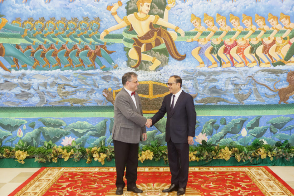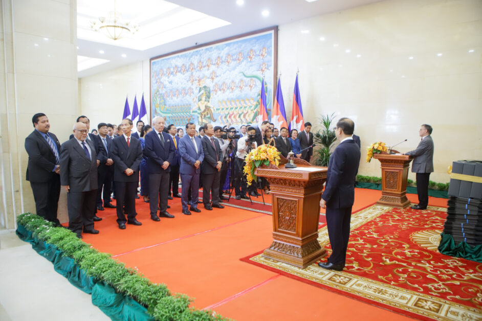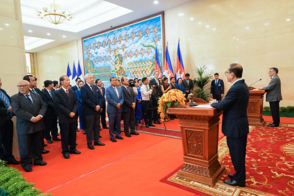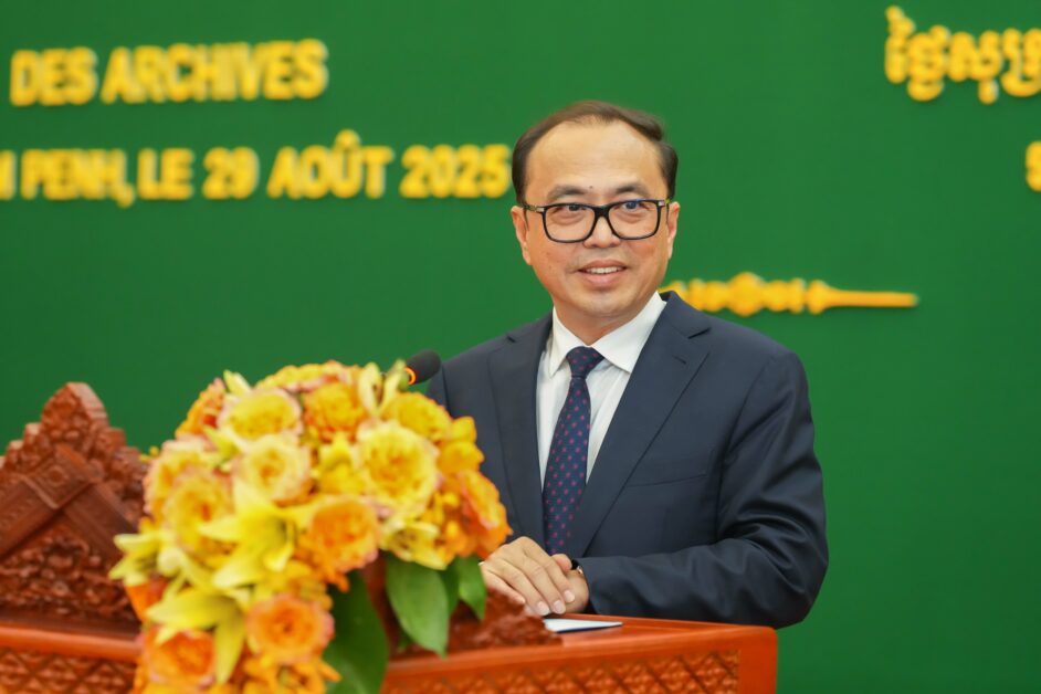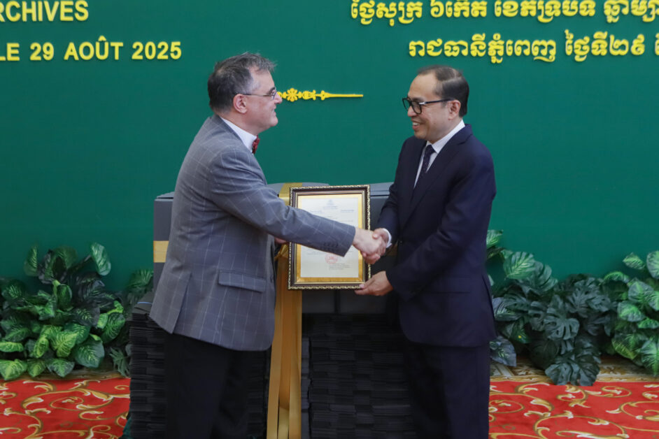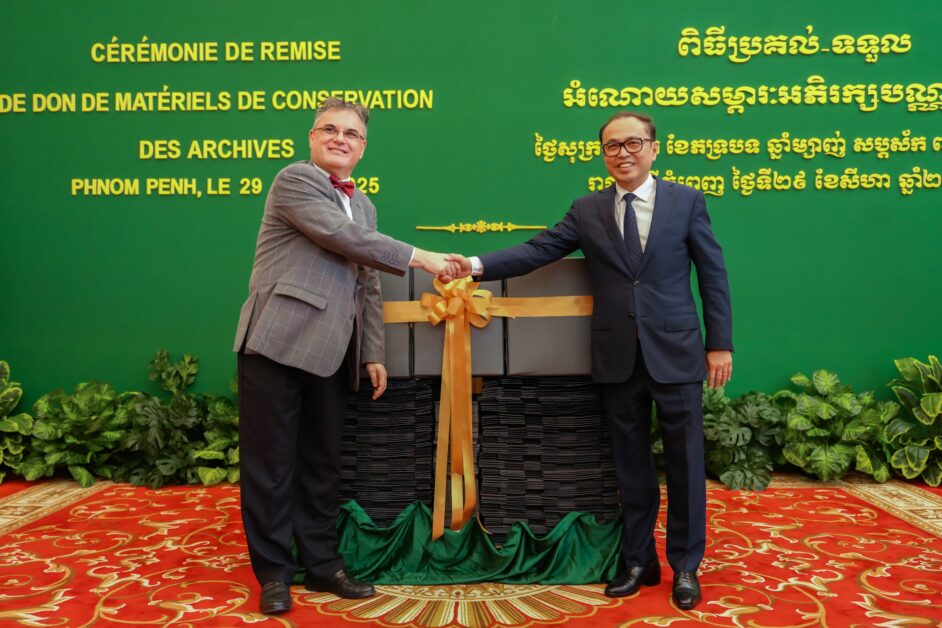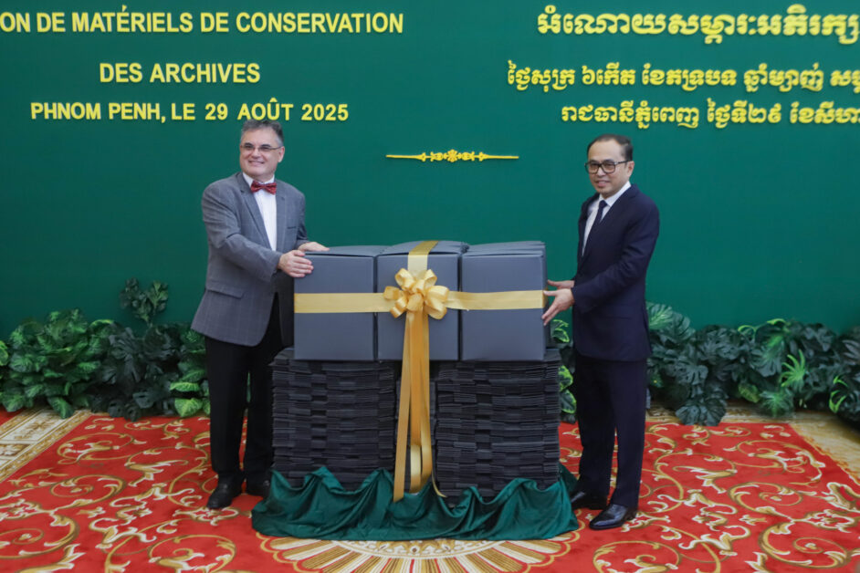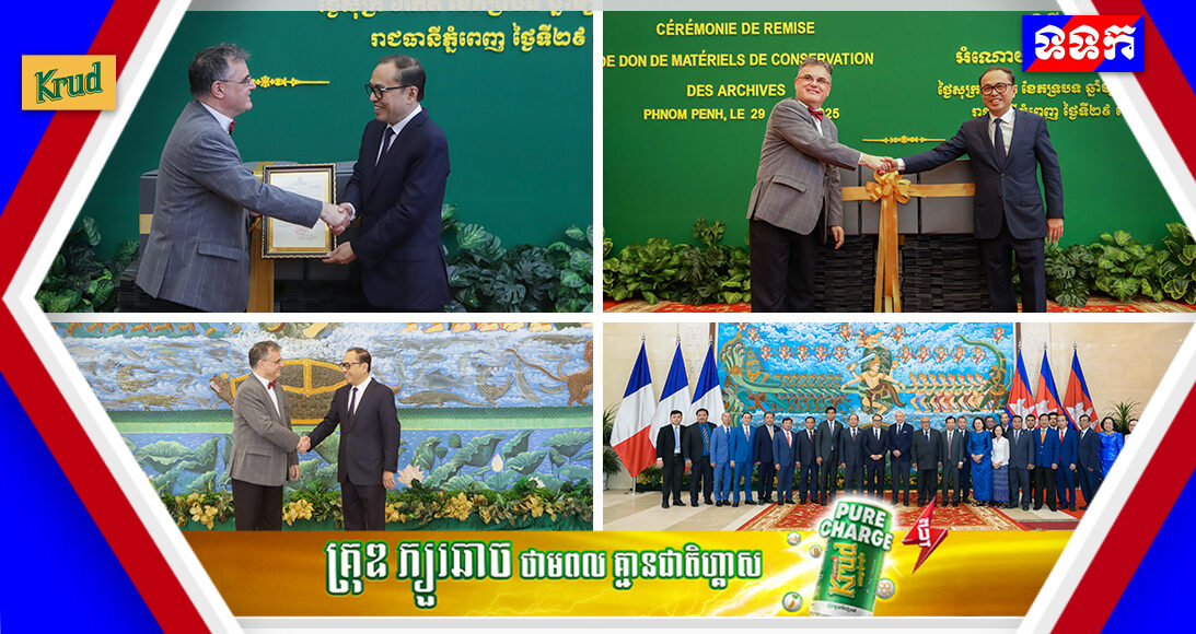 (រាជធានីភ្នំពេញ)៖ នាព្រឹកថ្ងៃសុក្រ ៦កើត ខែភទ្របទ ឆ្នាំម្សាញ់ សប្តស័ក ពស២៥៦៩ ត្រូវនឹងថ្ងៃទី២៩ ខែសីហា ឆ្នាំ២០២៥ នៅទីស្តីការគណៈរដ្ឋមន្រ្តី មានរៀបចំពិធីប្រគល់-ទទួលអំណោយសម្ភារៈអភិរក្សបណ្ណសារ រវាងស្ថានទូតបារាំង និងទីស្តីការគណៈរដ្ឋមន្រ្តី។ ពិធីនេះ បានប្រព្រឹត្តិទៅក្រោមអធិបតីភាពឯកឧត្តម វង្សី វិស្សុត ឧបនាយករដ្ឋមន្ត្រីប្រចាំការ រដ្ឋមន្ត្រីទទួលបន្ទុកទីស្តីការគណៈរដ្ឋមន្ត្រី និងជាប្រធានក្រុមប្រឹក្សាបណ្ណសារ និងឯកឧត្តម Olivier RICHARD ឯកអគ្គរដ្ឋទូតវិសាមញ្ញ និងពេញសមត្ថភាពនៃសាធារណរដ្ឋបារាំងប្រចាំព្រះរាជាណាចក្រកម្ពុជា ដោយមានការអញ្ជើញចូលរួមពីឯកឧត្តមទេសរដ្ឋមន្រ្តី អ៊ុក រ៉ាប៊ុន, ឯកឧត្ដមទេសរដ្ឋមន្រ្តី ថោង ខុន, និងឯកឧត្តមទេសរដ្ឋមន្រ្តី ឆែម គាតរិទ្ធី ព្រមទាំងឯកឧត្ដម លោកជំទាវ លោក លោកស្រី ជាថ្នាក់ដឹកនាំ និងមន្រ្តីរាជការនៃទីស្ដីការគណៈរដ្ឋមន្រ្តី។ សម្ភារៈអភិរក្សបណ្ណសារនេះ រួមមានប្រអប់ និងសឺមីដាក់ឯកសារចំនួន១0ដុំ មានទម្ងន់សរុប១,៣៨១គីឡូក្រាម ដែលជាអំណោយរបស់ក្រុមហ៊ុន Société Cauchard តាមរយៈស្ថានទូតបារាំងប្រចាំកម្ពុជា។