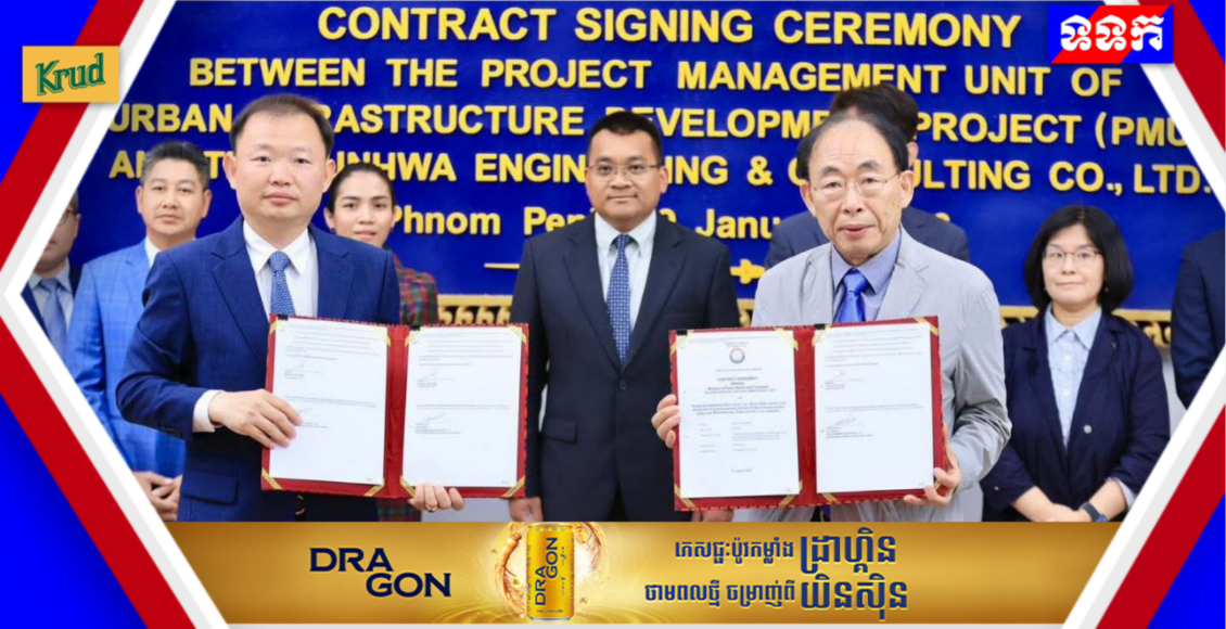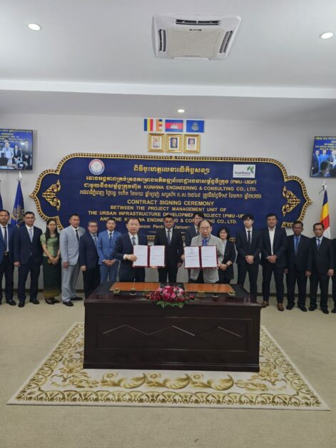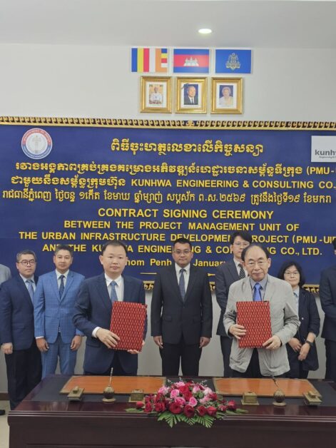 ពិធីចុះហត្ថលេខាលើកិច្ចសន្យា រវាងអង្គភាពគ្រប់គ្រងគម្រោងអភិវឌ្ឍន៍ហេដ្ឋារចនាសម្ព័ន្ធទីក្រុង (PMU-UIDP) ជាមួយនឹងសម្ព័ន្ធក្រុមហ៊ុន KUNHWA ENGINEERING & CONSULTING CO., LTD. ក្រោមហិរញ្ញប្បទានឥតសំណងពីមូលនិធិពិសេសសម្រាប់ការរៀបចំគម្រោង (Project Preparation Special Fund – PPSF) របស់ ធនាគារវិនិយោគហេដ្ឋារចនាសម្ព័ន្ធអាស៊ី (AIIB) ដើម្បីអនុវត្ត គម្រោងអភិវឌ្ឍន៍ហេដ្ឋារចនាសម្ព័ន្ធទីក្រុង (Urban Infrastructure Development Project – UIDP)។