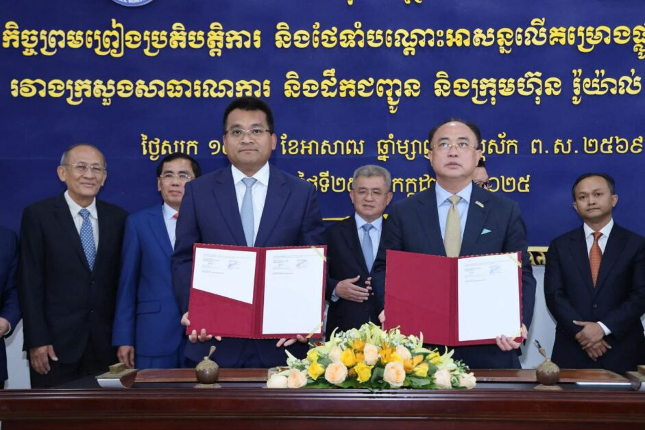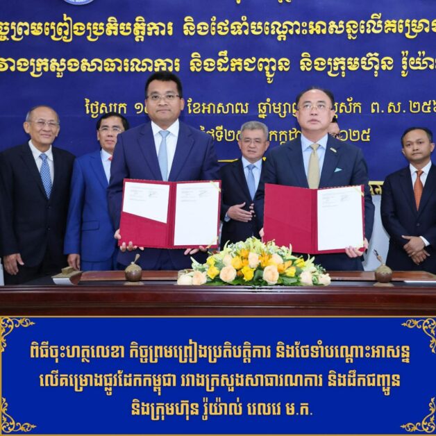 ទីស្តីការក្រសួង៖ នារសៀលថ្ងៃសុក្រ ទី២៥ ខែកក្កដា ឆ្នាំ២០២៥ ឯកឧត្តម ប៉េង ពោធិ៍នា រដ្ឋមន្ត្រីក្រសួងសាធារណការ និងដឹកជញ្ជូន បានអញ្ជើញជាអធិបតីក្នុងពិធីចុះហត្ថលេខា កិច្ចព្រមព្រៀងប្រតិបត្តិការ និងថែទាំបណ្តោះអាសន្ន លើគម្រោងផ្លូវដែកកម្ពុជា រវាងក្រសួងសាធារណការ និងដឹកជញ្ជូន ជាមួយក្រុមហ៊ុន រ៉ូយ៉ាល់ រេលវេ ម.ក. ដែលតំណាងដោយ អ្នកឧកញ៉ា គិត ម៉េង ប្រធានក្រុមប្រឹក្សាភិបាលក្រុមហ៊ុន រ៉ូយ៉ាល់ រេលវេ ម.ក. ដោយមានការអញ្ជើញចូលរួមពី ថ្នាក់ដឹកនាំពាក់ព័ន្ធ នៃក្រសួងសាធារណការ និងជញ្ជូន គណៈកម្មការអន្តរក្រសួងចរចាកិច្ចព្រមព្រៀងសម្បទានផ្លូវដែក ប្រតិភូ ក្រុមហ៊ុន រ៉ូយ៉ាល់ រេលវេ ម.ក. និងមន្រ្តីជំនាញពាក់ព័ន្ធ។
