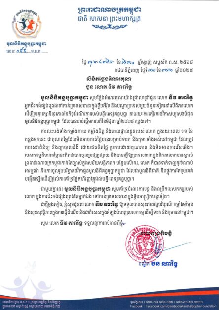 ជាថ្មីម្តងទៀត ឯកឧត្តម រដ្ឋមន្ត្រី នេត្រ ភក្ត្រា បានអាននូវលិខិតរបស់ មូលនិធិគន្ធបុប្ផាកម្ពុជា សូមថ្លែងអំណរគុណយ៉ាងជ្រាលជ្រៅជូន លោក ទីវ តារារិទ្ធ អ្នកជិះកង់ផ្សងព្រេងទៅកាន់ប្រទេសនានាក្នុងទ្វីបអឺរ៉ុប និងបណ្តាប្រទេសមួយចំនួនទៀតនៅលើពិភពលោក ដើម្បីរួមគ្នារក្សានិរន្តរភាពនៃកិច្ចដំណើរការរបស់មន្ទីរពេទ្យគន្ធបុប្ផា តាមរយៈការកៀរគរថវិកាសប្បុរសធម៌ជូន មូលនិធិគន្ធបុប្ផាកម្ពុជា ដែលបានចាប់ផ្តើមកាលពីខែមិថុនា ឆ្នាំ២០២៤ កន្លងទៅ។