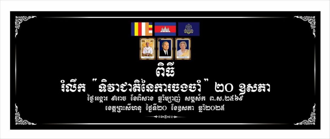 ព្រឹកថ្ងៃទី២០ ខែឧសភា ឆ្នាំ ២០២៥ ពីធីរំលឹក«ទិវាជាតិនៃការចងចាំ» ២០ ឧសភា ក្រោមអធិបតីភាព ឯកឧត្តម វង្ស ផាណាត ប្រធានក្រុមប្រឹក្សាខេត្តព្រះសីហនុ ដោយមានការនិមន្តចូលរួមពីព្រះមេគុណខេត្ត ព្រះគ្រូ ចៅអធិការវត្តក្នុងខេត្តព្រះសីហនុ មន្ត្រីរាជការ កងកម្លាំងប្រដាប់អាវុធ អាជ្ញាធរសង្កាត់ លោកគ្រូ អ្នកគ្រូ យុវជនកាយរិទ្ធ យុវជនកាកបាទក្រហម។