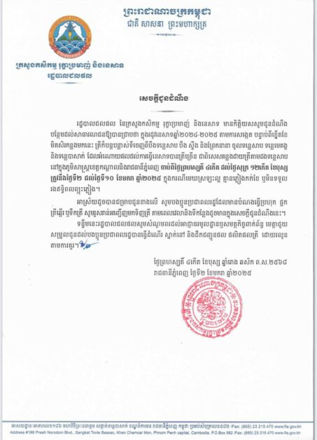 រដ្ឋបាលជលផល នៃក្រសួងកសិកម្ម រុក្ខាប្រមាញ់ និងនេសាទ មានកិត្តិយសសូមជូនដំណឹង បន្ថែមដល់សាធារណជនឱ្យបានជ្រាបថា ក្នុងរដូវនេសាទឆ្នាំ២០២៤-២០២៥ តាមការសង្កេត បន្ទាប់ពីខ្នើតខែ មិគសិរកន្លងមកនេះ ត្រីក៏បន្តបន្លាស់ទីចេញពីបឹងទន្លេសាប បឹង ស្ទឹង និងព្រែកនានា ចូលទន្លេសាប ទន្លេមេគង្គ និងទន្លេបាសាក់ ដែលអំណោយផលដល់ការធ្វើនេសាទបានត្រីច្រើន ជាពិសេសគន្លងដោយត្រីតាមដងទន្លេសាប នៅក្នុងភូមិសាស្ត្រខេត្តកណ្តាលនិងរាជធានីភ្នំពេញ ចាប់ពីថ្ងៃព្រហស្បតិ៍ ៤កើត ដល់ថ្ងៃសុក្រ ១២កើត ខែបុស្ស ត្រូវនឹងថ្ងៃទី២ ដល់ថ្ងៃទី១០ ខែមករា ឆ្នាំ២០២៥ ក្នុងករណីមេឃស្រឡះល្អ គ្មានភ្លៀងកក់ខែ ឬមិនទទួល រងឥទ្ធិពលព្យុះភ្លៀង។