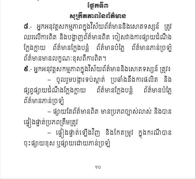 យោងតាមធម្មនុញ្ញវិជ្ជាជីវៈសារព័ត៌មាន ផ្នែកទី៣ ទាក់ទងនឹងសុក្រឹតភាពនៃព័ត៌មានចែងថា៖ ១-អ្នកអនុវត្តសកម្មភាពក្នុងវិស័យព័ត៌មាននិងសោតទស្សន៍ (ទាំងអ្នកសារព័ត៌មានអាជីព អ្នកផលិតមាតិកា អ្នកសរសេរប្លុក អ្នកសារព័ត៌មានគ្មានអង្គភាព អ្នកសារព័ត៌មានពលរដ្ឋ អ្នកមានប្រជាប្រិយលើបណ្តាញសង្គមជាដើម) ត្រូវឈរលើការពិត និងបង្ហាញព័ត៌មានពិត ចៀសវាងការផ្សាតយដំណឹងក្លែងក្លាយ ព័ត៌មានក្លែងបន្លំ ព័ត៌មានបំភ្លៃ ព័ត៌មានភាន់ច្រឡំ ព័ត៌មានមានលក្ខណៈខុសពីការពិត។ ២-អ្នកអនុវត្តសកម្មភាពក្នុងវិស័យព័ត៌មានត្រូវ (ក) ចូលរួមទប់ស្កាត់ ប្រឆាំងនឹងការផលិត និងផ្សព្វផ្សាយដំណឹងក្លែងក្លាយ ព័ត៌មានក្លែងបន្លំ ព័ត៌មានបំភ្លៃ ព័ត៌មានភាន់ច្រឡំ (ខ) ផ្សាយតែព័ត៌មានពិត មានប្រភពច្បាស់លាស់ និងបានផ្ទៀងផ្ទាត់ប្រភពត្រឹមត្រូវ (គ) ផ្ទៀងផ្ទាត់ឡើងវិញ និងកែតម្រូវក្នុងករណីបានចុះផ្សាយខុស ឬផ្សាយដោយភាន់ច្រឡំ (គ) រក្សាការសម្ងាត់នៃប្រភព (ឃ) ធានាតុល្យភាពព័ត៌មានប្រកបដោយសច្ចភាព យុត្តិធម៌ និងមិនលម្អៀង។ ៣-អ្នកអនុវត្តសកម្មភាពក្នុងវិស័យព័ត៌មាននិងសោតទស្សន៍ត្រូវចៀសវាង (ក) ការចុះផ្សាយព័ត៌មានដែលគ្មានប្រភពច្បាស់លាស់ ឬធ្វើការចោទប្រកាន់ដែលមិនមានភស្តុតាងគ្រប់គ្រាន់ និងច្បាស់លាស់ (ខ)កាឡៃព័ត៌មានតាមរូបភាពណាមួយដែលធ្វើឱ្យប្រាសចាកន័យដើម (គ) បញ្ចេញមតិផ្ទាល់ខ្លួនឈរលើបុរេវិនិច្ឆ័យ (ឃ) ច្របល់គ្នារវាង ការពិតដែលជាអង្គហេតុ និងការយល់ឃើញដែលជាទស្សនៈផ្ទាល់ខ្លួន (ង) កែប្រែព័ត៌មាន រូបភាព ឬវីដេអូ លុបបំបាត់ចោលផ្នែកព័ត៌មានសំខាន់ៗ ឬបន្លំឯកសារផ្សេងៗ។