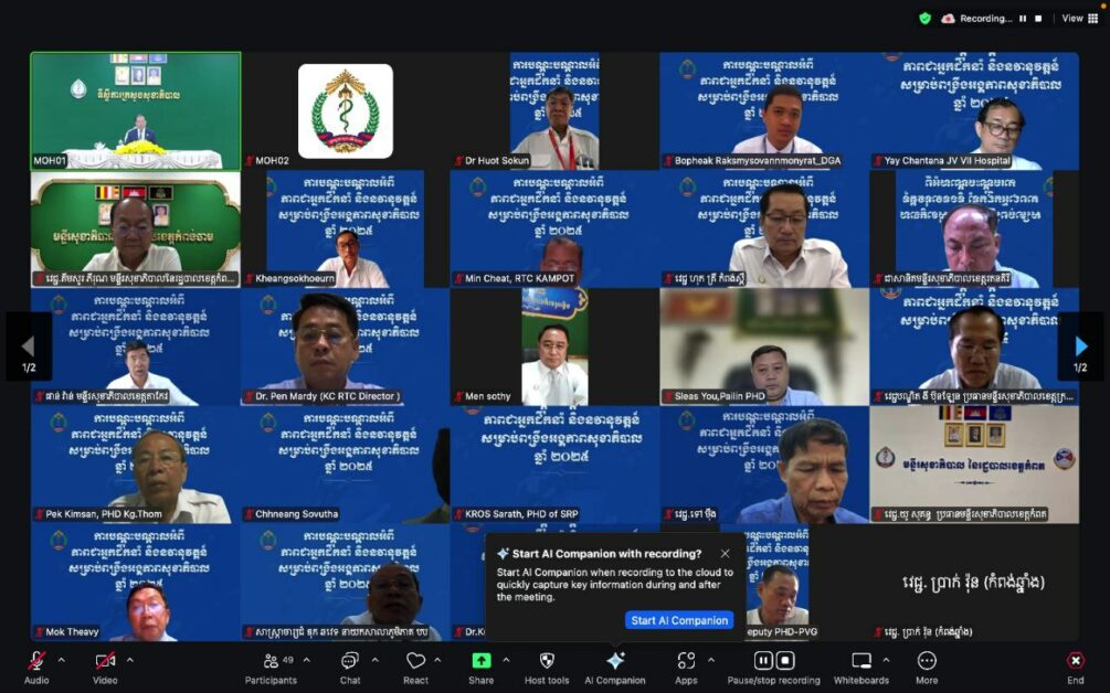 កិច្ចប្រជុំនេះ មានការអញ្ជើញចូលរួមពី ឯកឧត្តម លោកជំទាវ រដ្ឋលេខាធិការ អនុរដ្ឋលេខាធិការ ទីប្រឹក្សាក្រសួងសុខាភិបាល អគ្គនាយក លោក លោកស្រី អគ្គនាយករង ប្រធានានយដ្ឋាន អនុប្រធាននាយកដ្ឋាន ប្រធានការិយាល័យ នៃទីស្តីការក្រសួងសុខាភិបាល និងឯកឧត្តម លោកជំទាវ លោក លោកស្រីប្រធានអង្គភាពថ្នាក់កណ្តាល មន្ទីរពេទ្យជាតិ ព្រមទាំង ឯកឧត្តម លោកជំទាវ លោក លោកស្រី ប្រធានមន្ទីរសុខាភិបាល នៃរដ្ឋបាលរាជធានី ខេត្ត ដែលចូលរួមតាមប្រព័ន្ធ Zoom ។
