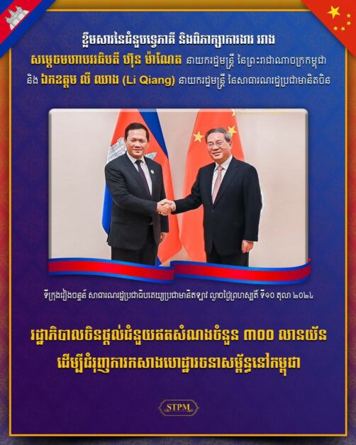 នាល្ងាចថ្ងៃទី១០ ខែតុលា ឆ្នាំ២០២៤ សម្តេចមហាបវរធិបតី ហ៊ុន​ ម៉ាណែត​ នាយករដ្ឋមន្ត្រី នៃព្រះរាជាណាចក្រកម្ពុជា​ បានជួបពិភាក្សាទ្វេភាគីជាមួយ ឯកឧត្តម លី ឈាង (Li Qiang) នាយករដ្ឋមន្ត្រី នៃសាធារណរដ្ឋប្រជាមានិតចិន ក្នុងឱកាសនៃការចូលរួមកិច្ចប្រជុំកំពូលអាស៊ាន លើកទី៤៤ និង ៤៥ និងកិច្ចប្រជុំកំពូលពាក់ព័ន្ធ ពីថ្ងៃទី៩ ដល់ថ្ងៃទី ១១ ខែតុលា ឆ្នាំ២០២៤ នៅរដ្ឋធានីវៀងចន្ទន៍ នៃសាធារណរដ្ឋប្រជាធិបតេយ្យប្រជាមានិតឡាវ។