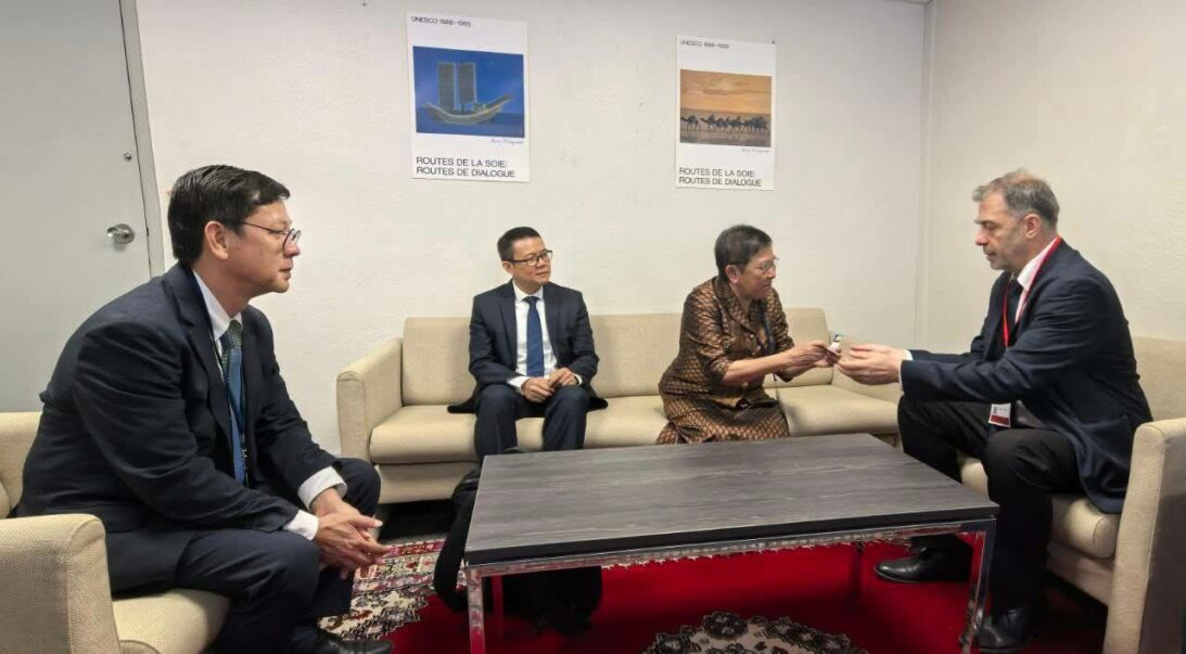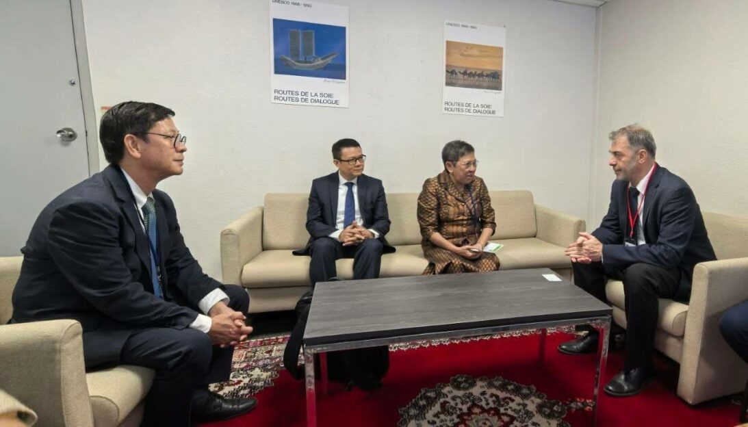 លោកជំទាវបណ្ឌិតសភាចារ្យ ភឿង សកុណា រដ្ឋមន្ត្រីក្រសួងវប្បធម៌និងវិចិត្រសិល្បៈជូបសម្តែងការគួរសមជាមួយប្រធានគណ:កម្មាធិការបេតិកភណ្ឌពិភពលោកលើកទី៤៧